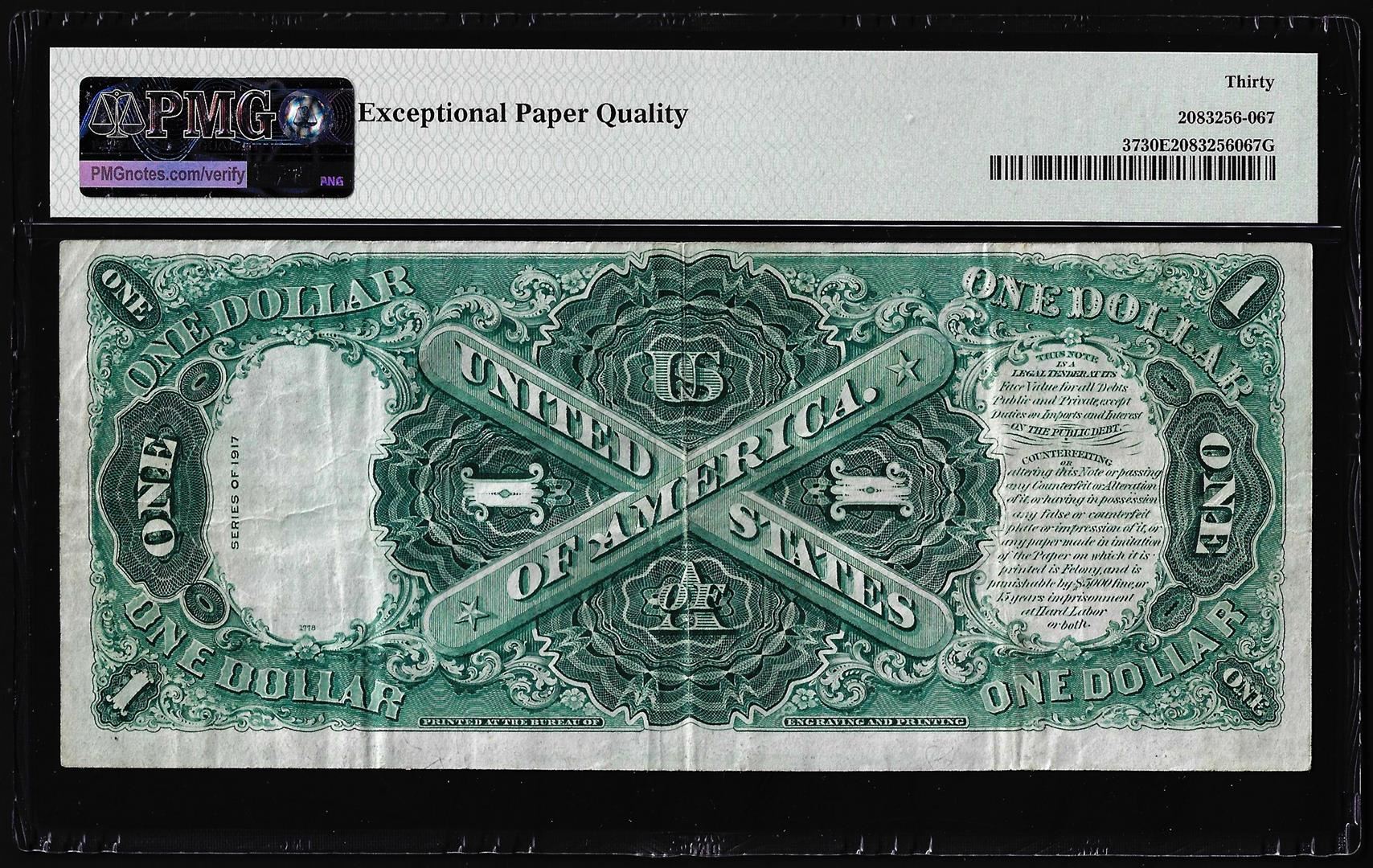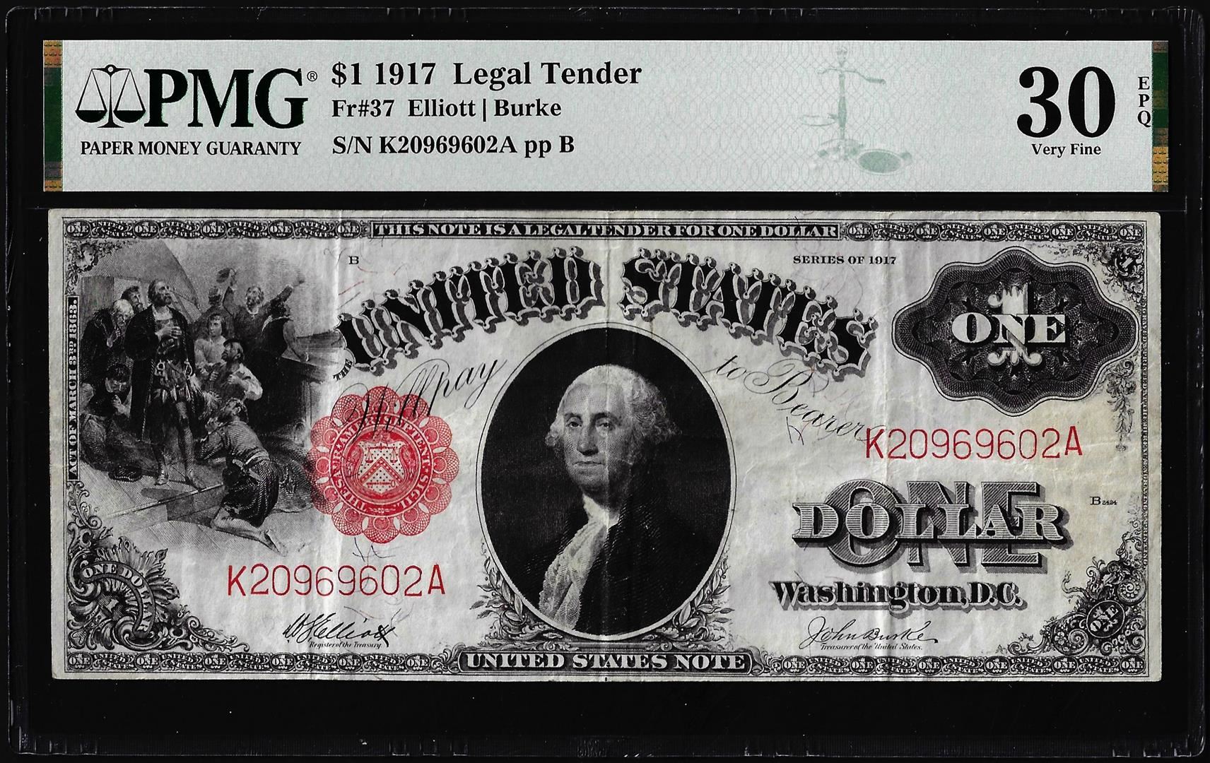 One 1917 $1 Legal Tender Note Fr.37 PMG Very Fine 30EPQ. PMG Certified.