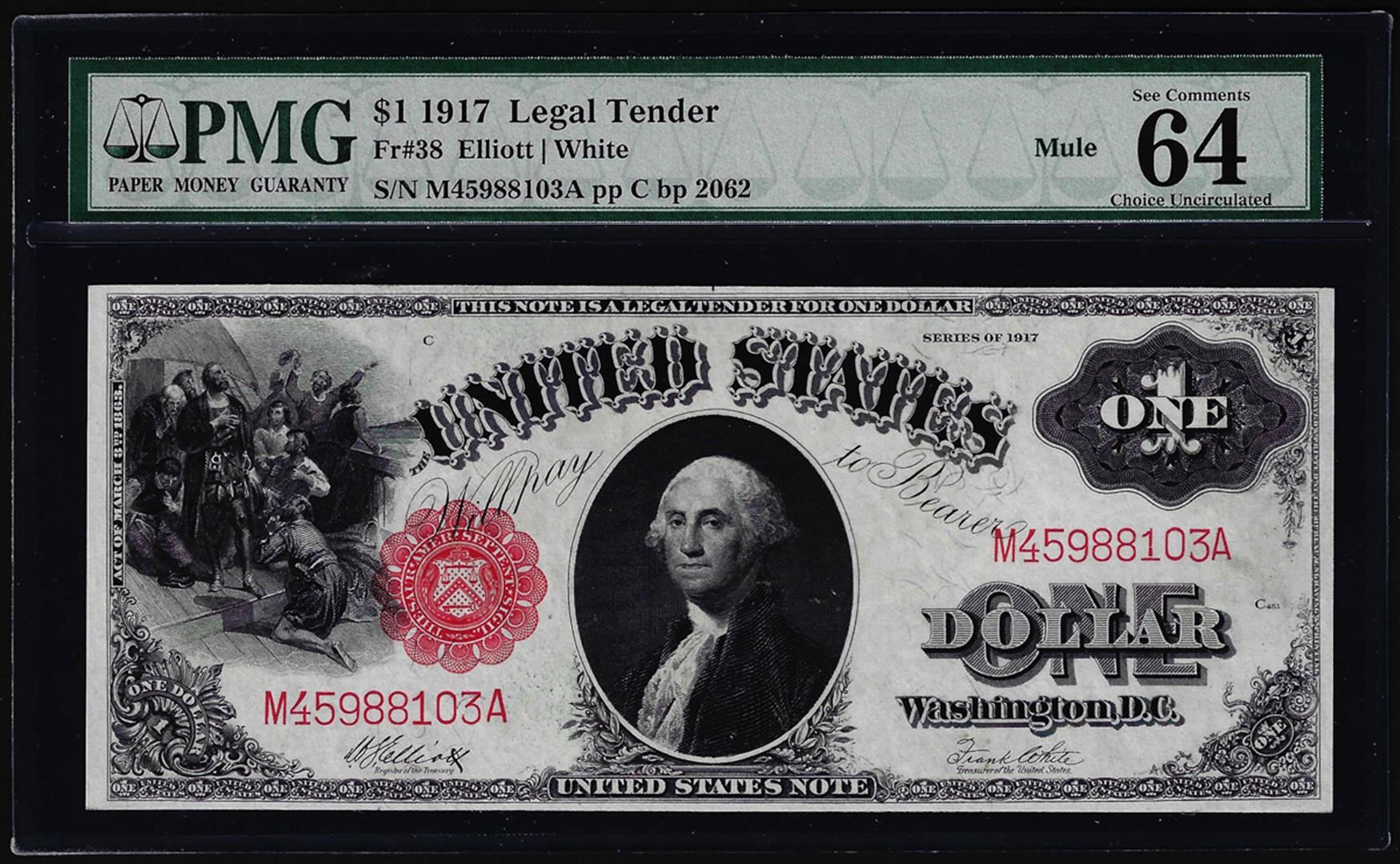 One 1917 $1 Legal Tender Note Fr.38 PMG Choice Uncirculated 64EPQ Mule. PMG Certified.