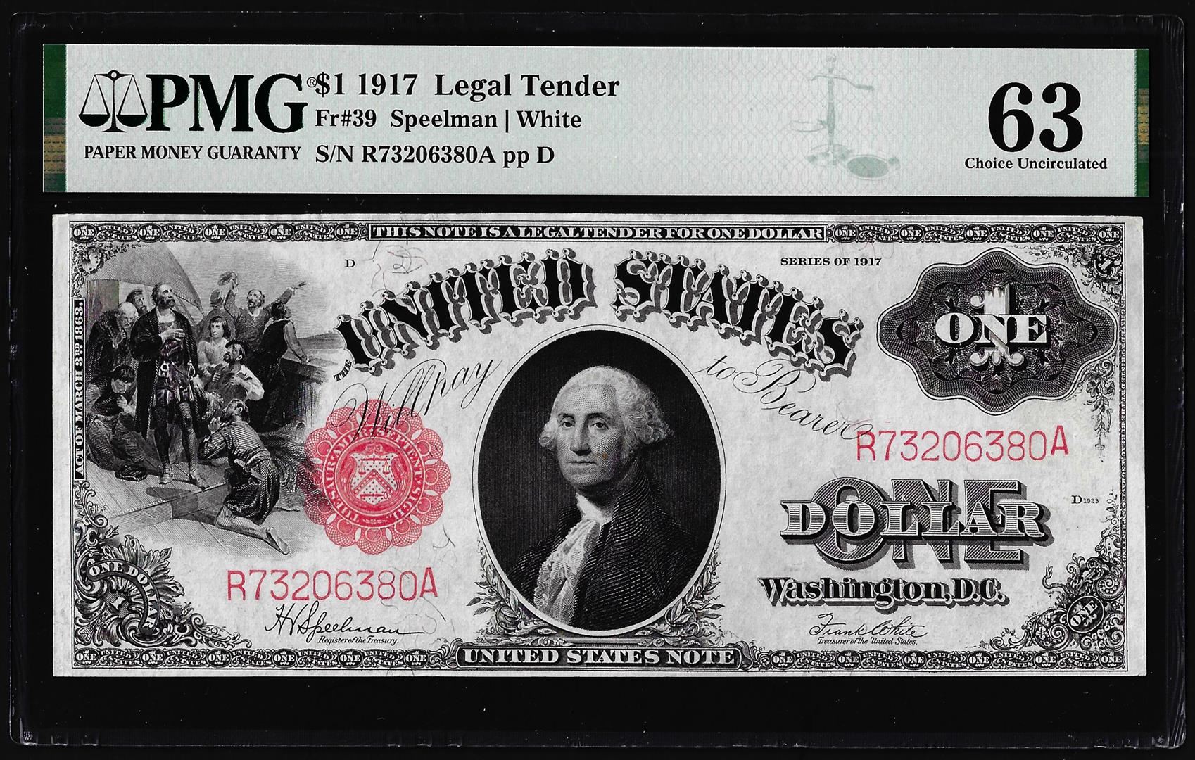 One 1917 $1 Legal Tender Note Fr.39 PMG Choice Uncirculated 63. PMG Certified.