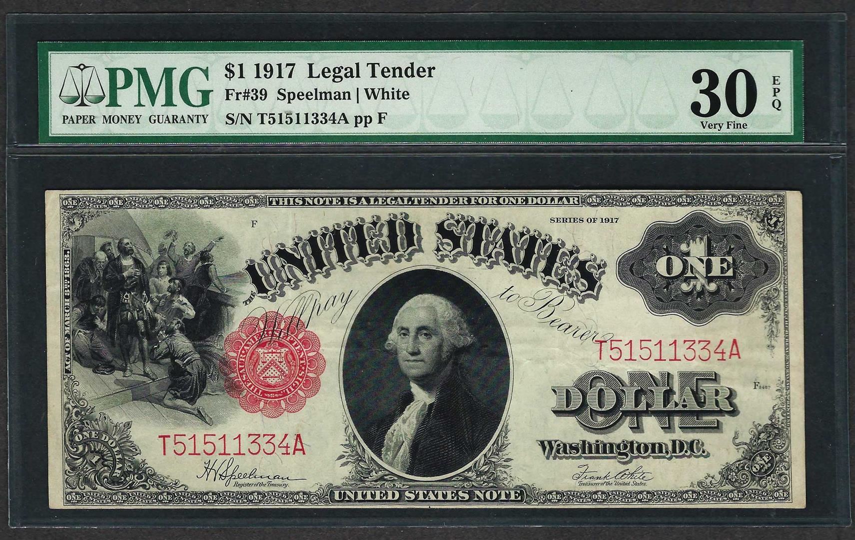 One 1917 $1 Legal Tender Note Fr.39 PMG Very Fine 30EPQ. PMG Certified.