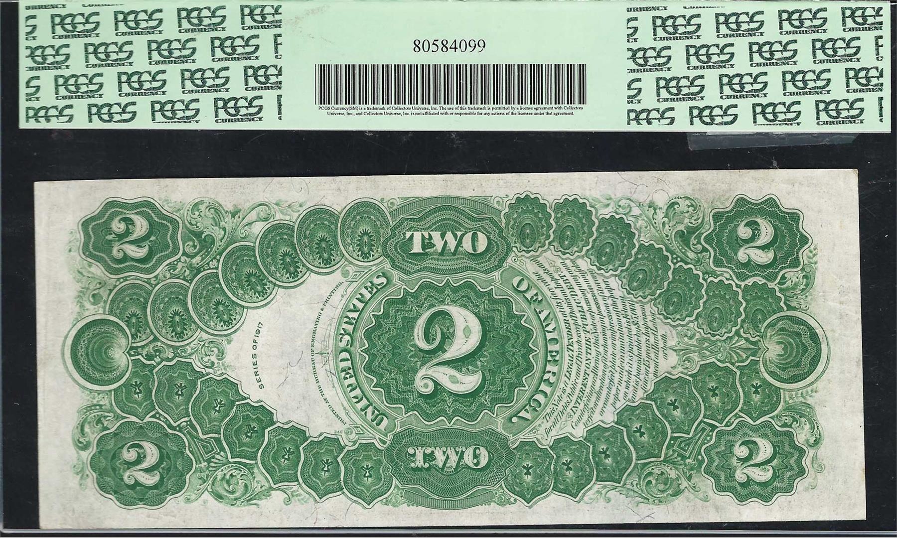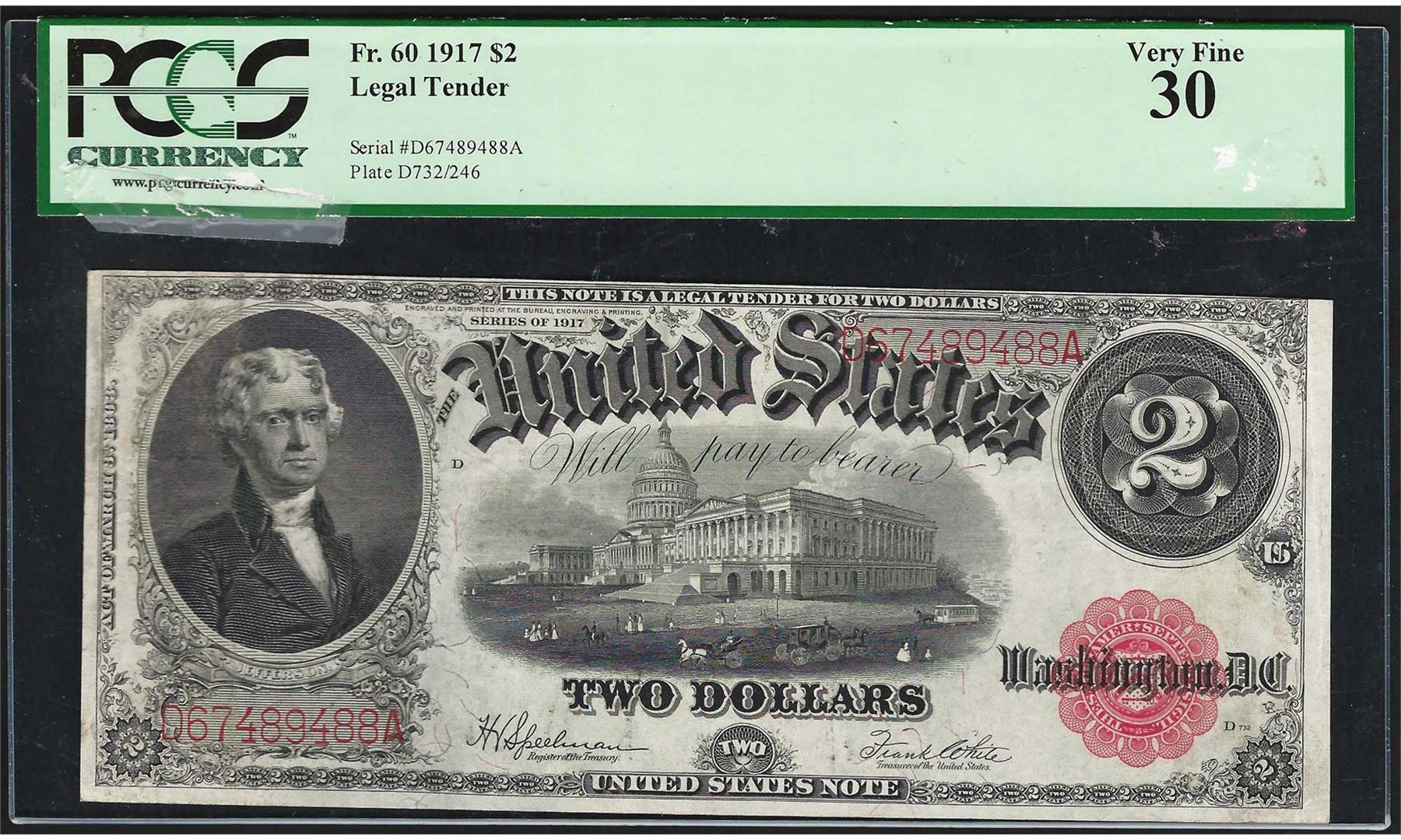 One 1917 $2 Legal Tender Note Fr.60 PCGS Very Fine 30. PCGS Graded.