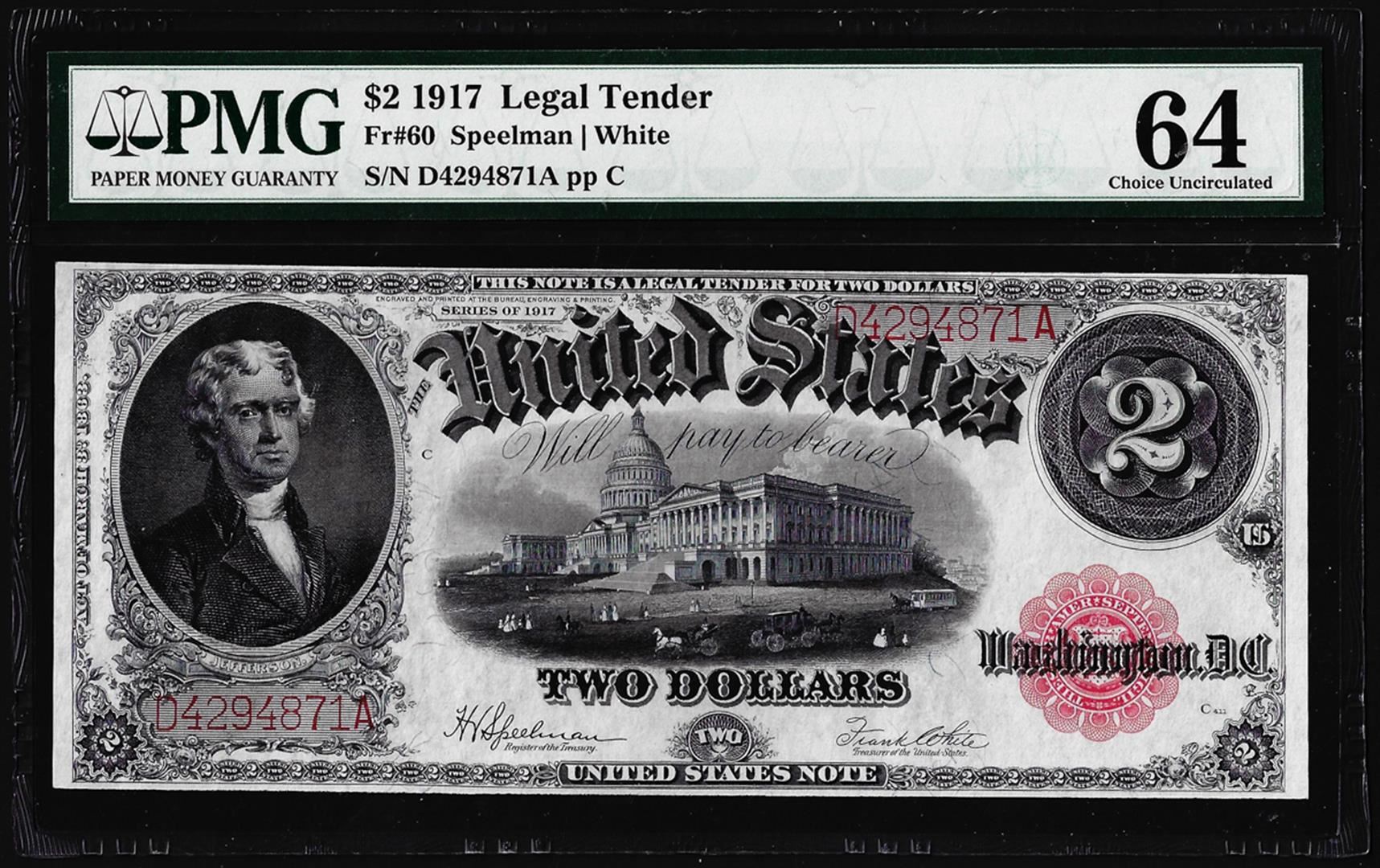 One 1917 $2 Legal Tender Note Fr.60 PMG Choice Uncirculated 64. PMG Certified.