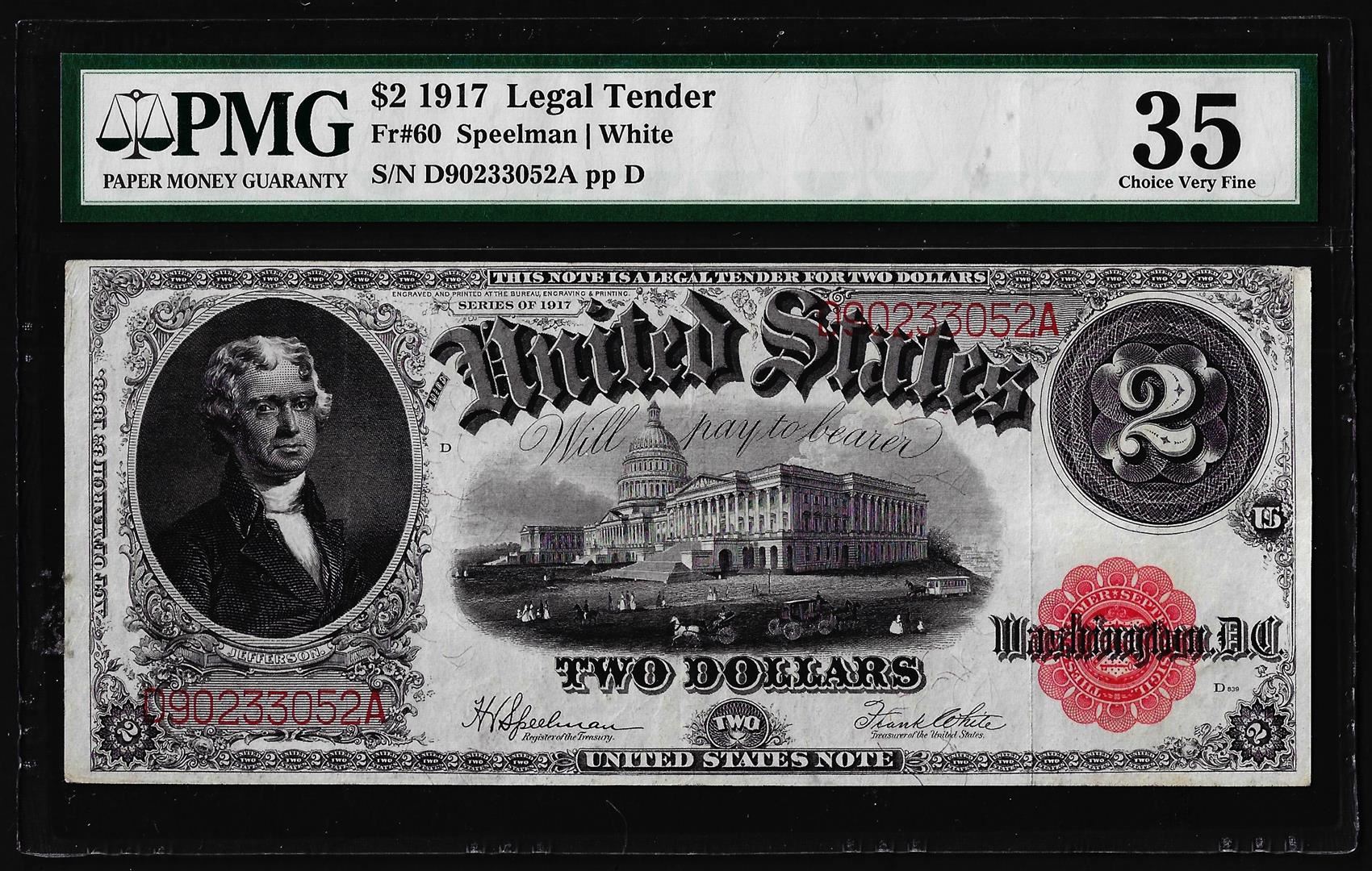 One 1917 $2 Legal Tender Note Fr.60 PMG Choice Very Fine 35. PMG Certified.
