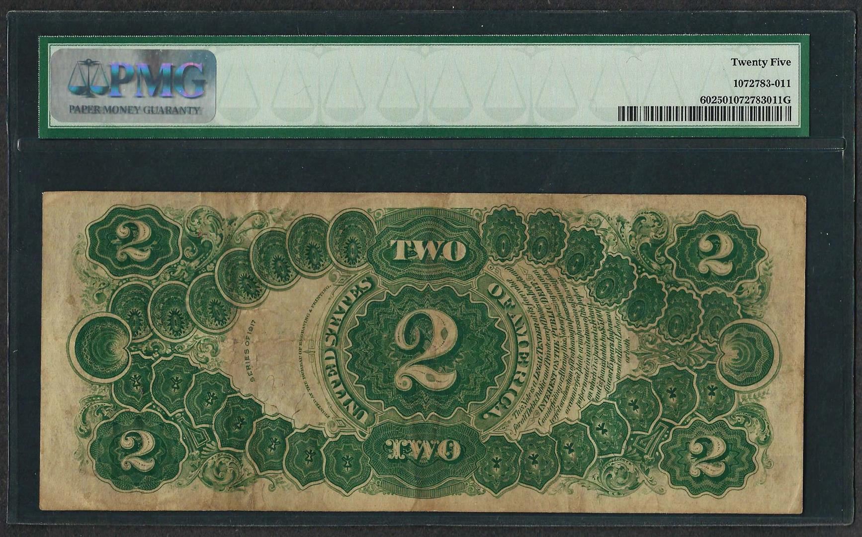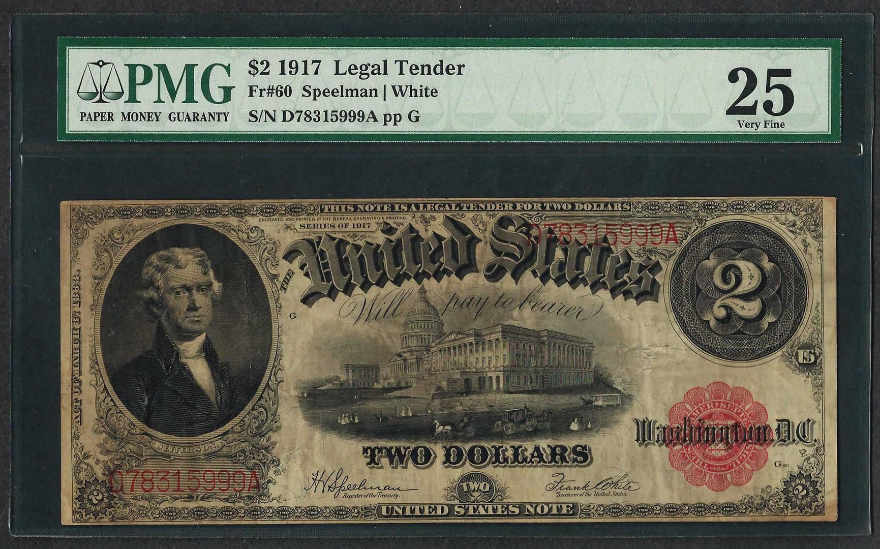 One 1917 $2 Legal Tender Note Fr.60 PMG Very Fine 25. PMG Certified.