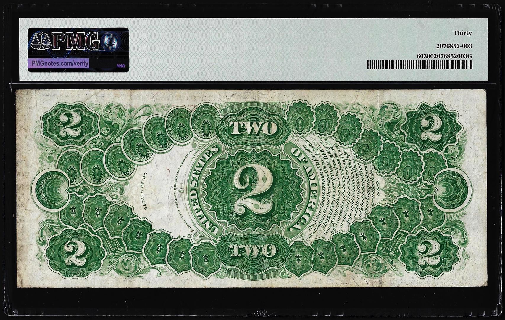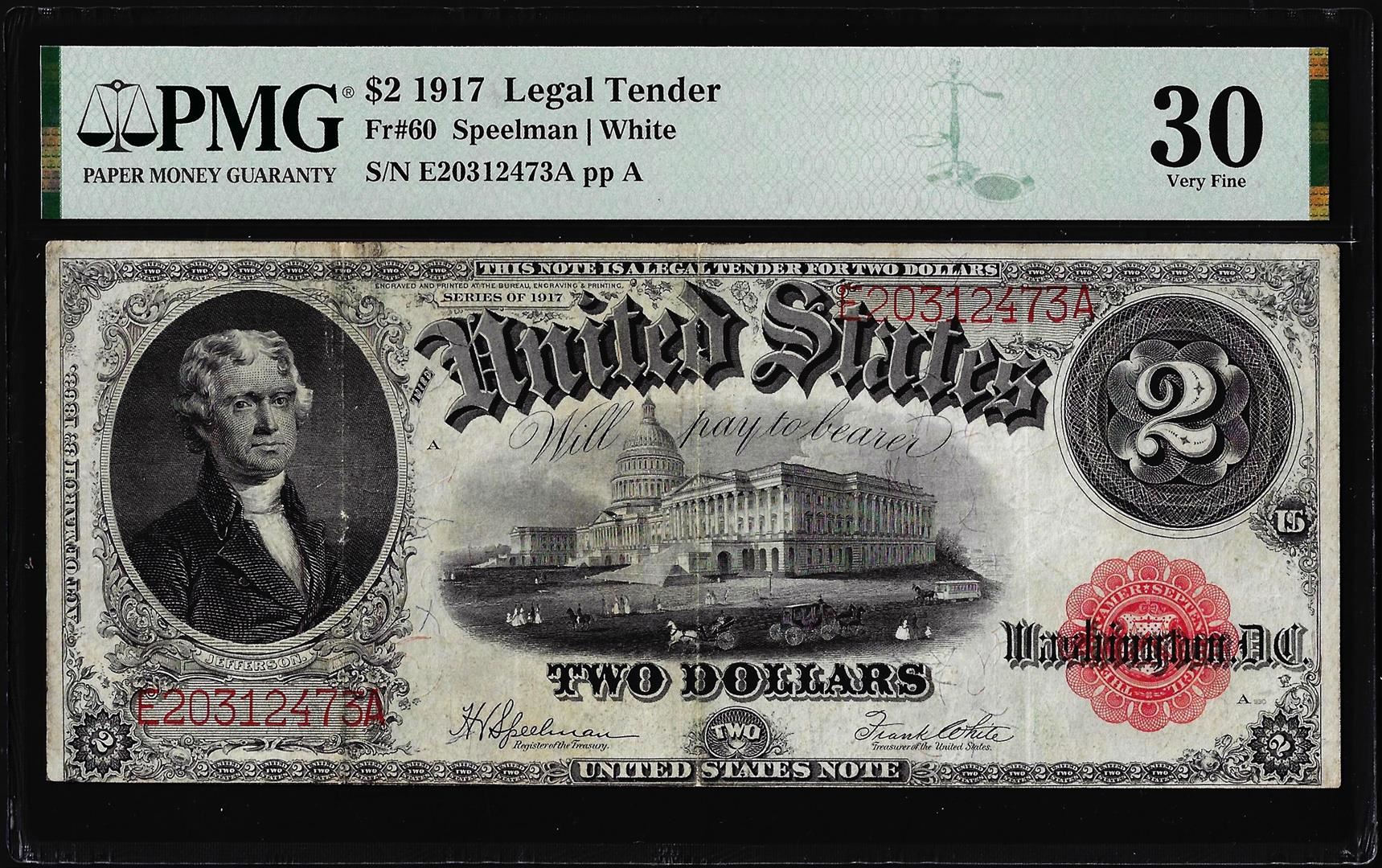 One 1917 $2 Legal Tender Note Fr.60 PMG Very Fine 30. PMG Certified.