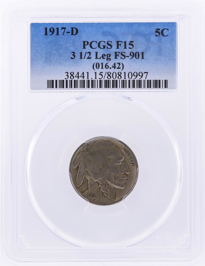 One 1917-D 3 1/2 Leg Buffalo Nickel FS-901 PCGS Graded F15. PCGS Graded.