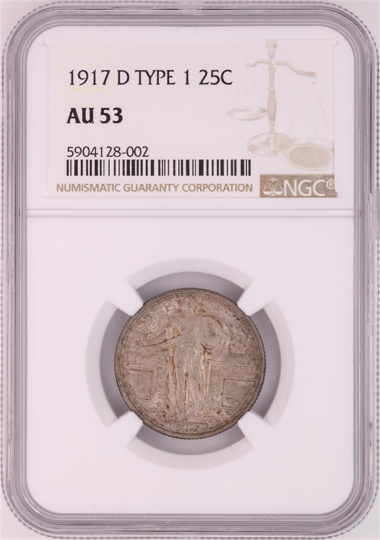 One 1917-D Standing Liberty Quarter Coin NGC AU53. NGC Certified.