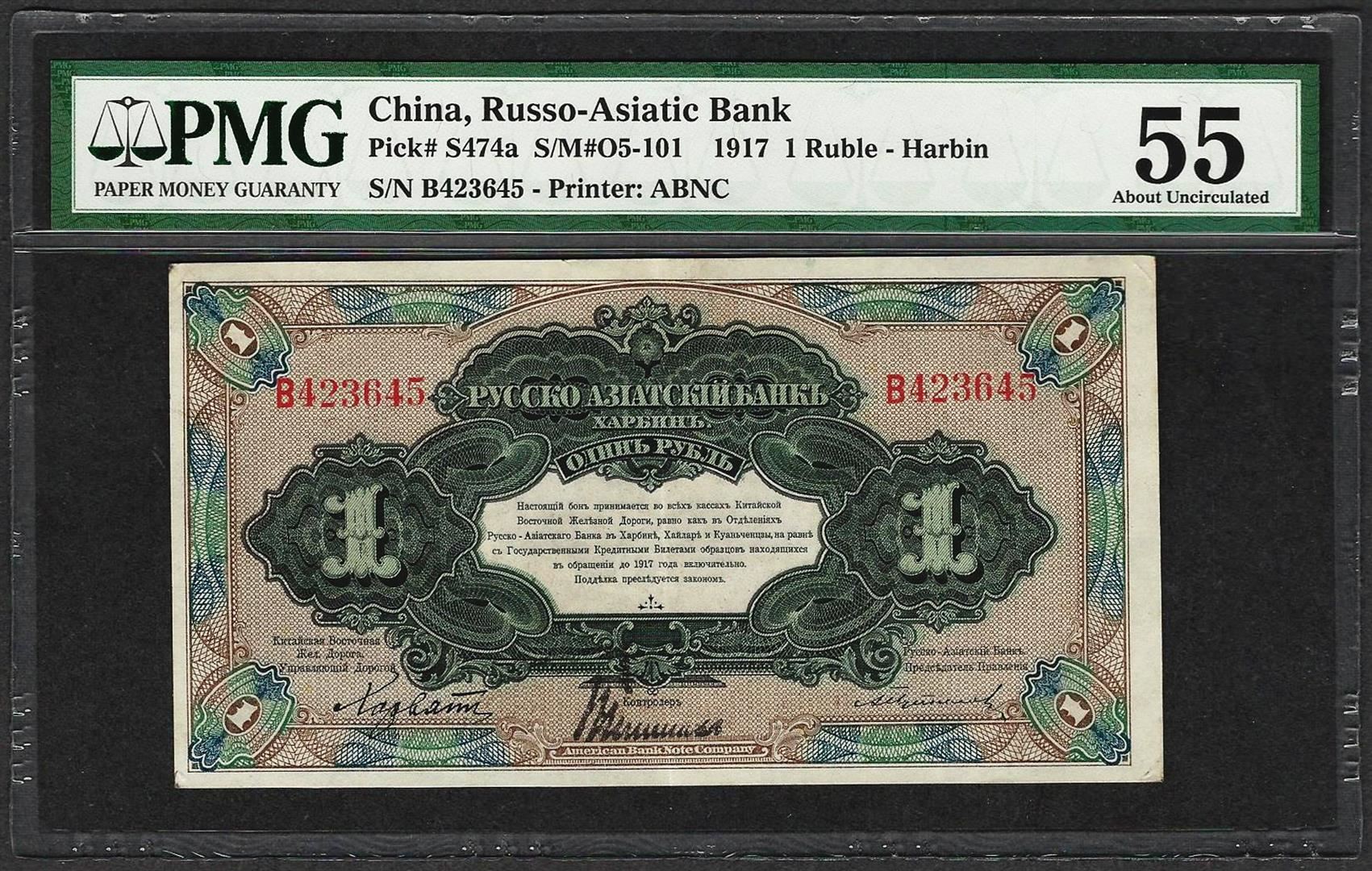 One 1917 Russo-Asiatic Bank China 1 Ruble Pick# S474a PMG About Uncirculated 55. PMG Certified.