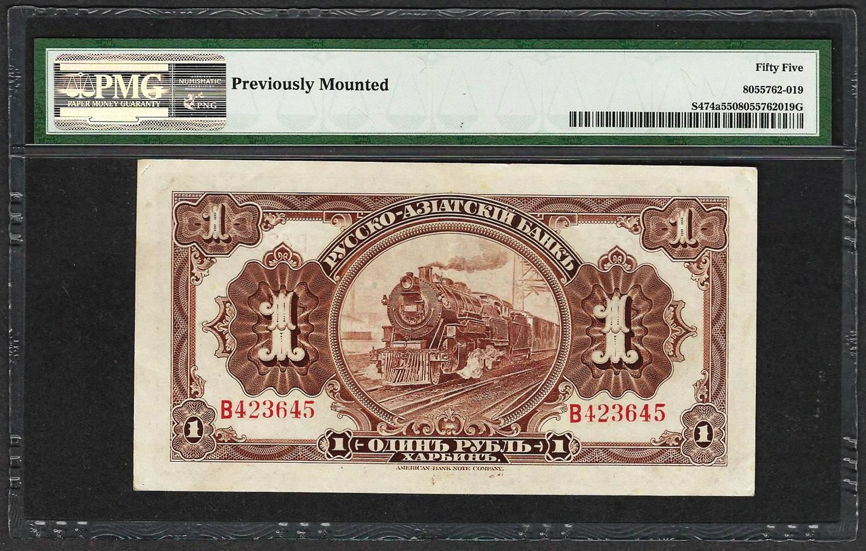 One 1917 Russo-Asiatic Bank China 1 Ruble Pick# S474a PMG About Uncirculated 55. PMG Certified.