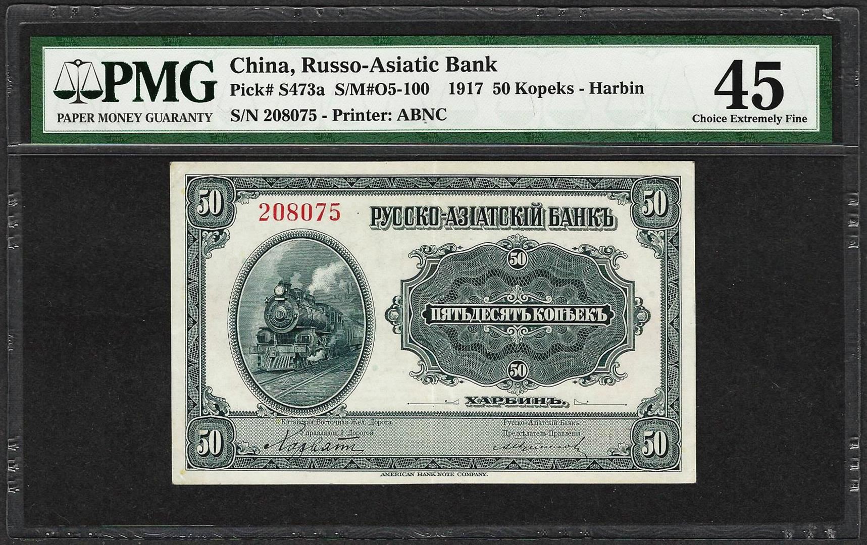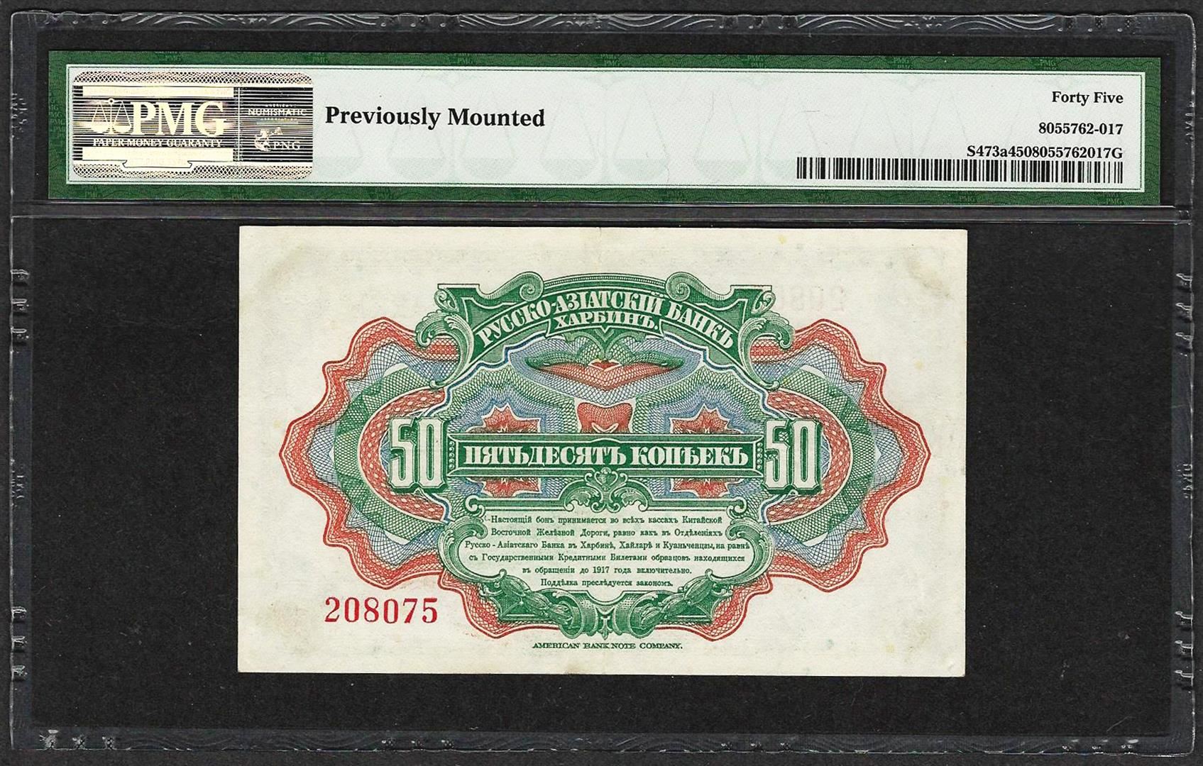One 1917 Russo-Asiatic Bank China 50 Kopeks Pick# S473a PMG Choice Extremely Fine 45. PMG Certified.
