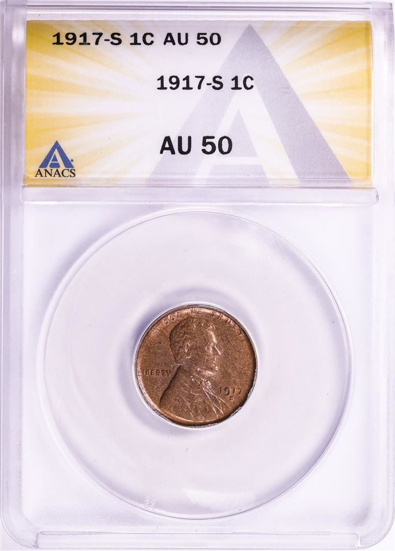 One 1917-S Lincoln Wheat Cent Coin ANACS AU50. ANACS Certified.