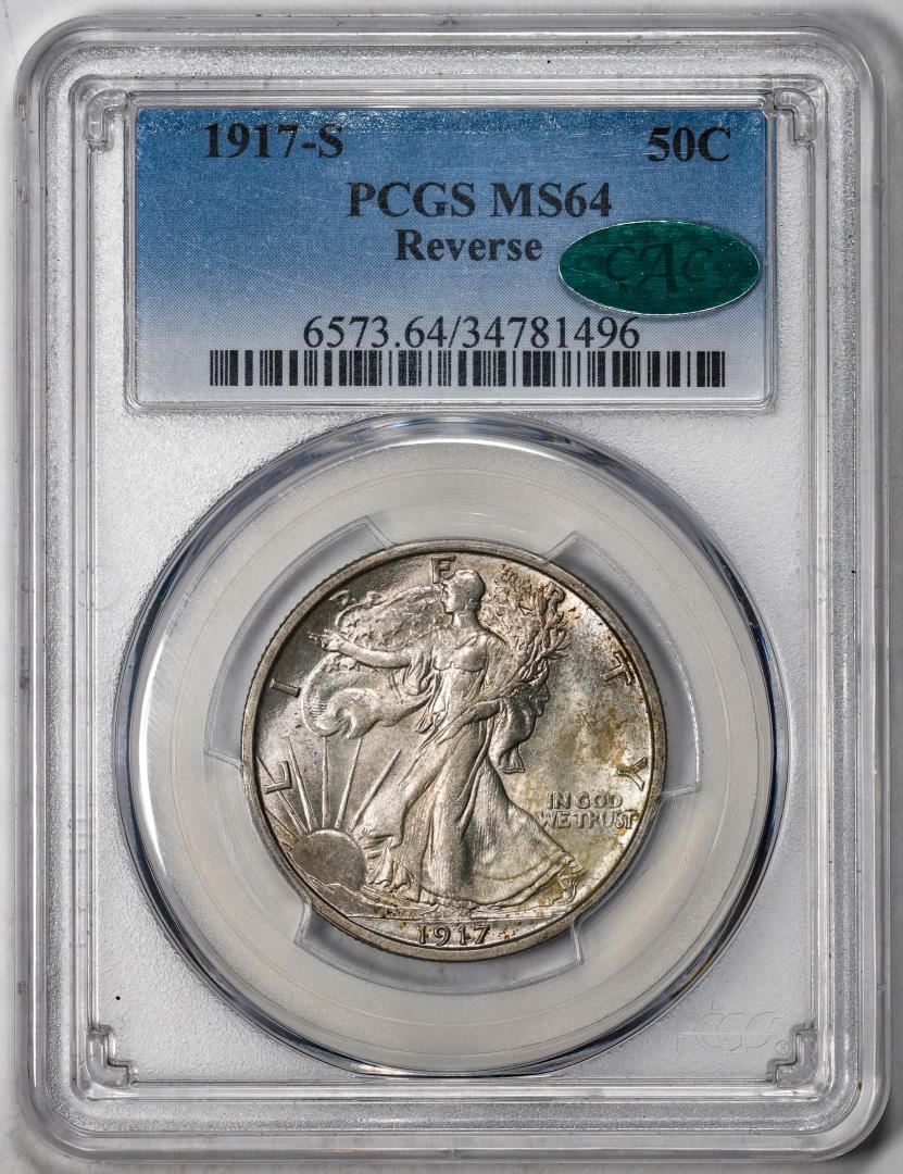 One 1917-S Reverse Walking Liberty Half Dollar Coin PCGS MS64 CAC. PCGS Graded.
