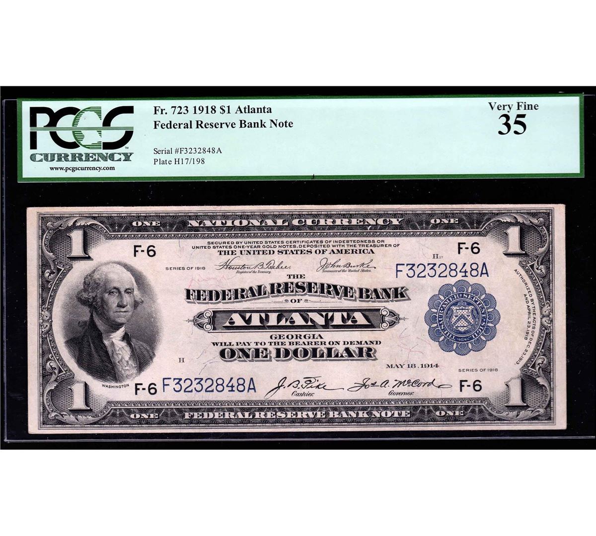 One 1918 $1 Federal Reserve Bank Note Atlanta PCGS VF35. PCGS Graded.