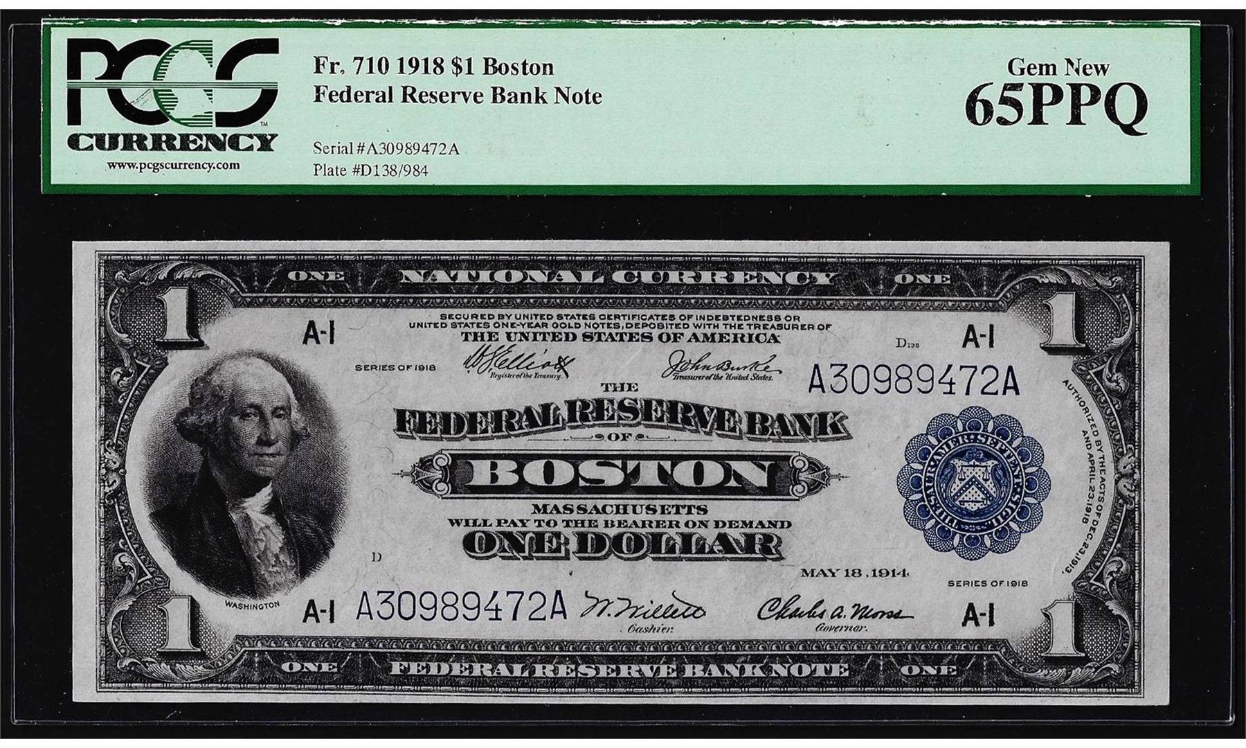 1918 $1 Federal Reserve Bank Note Boston Fr.710 PCGS Gem New 65PPQ