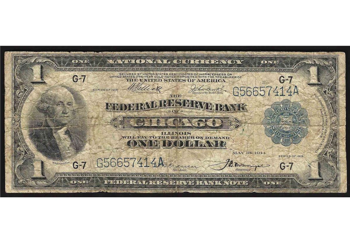 1918 $1 Federal Reserve Bank Note Chicago National Currency Note