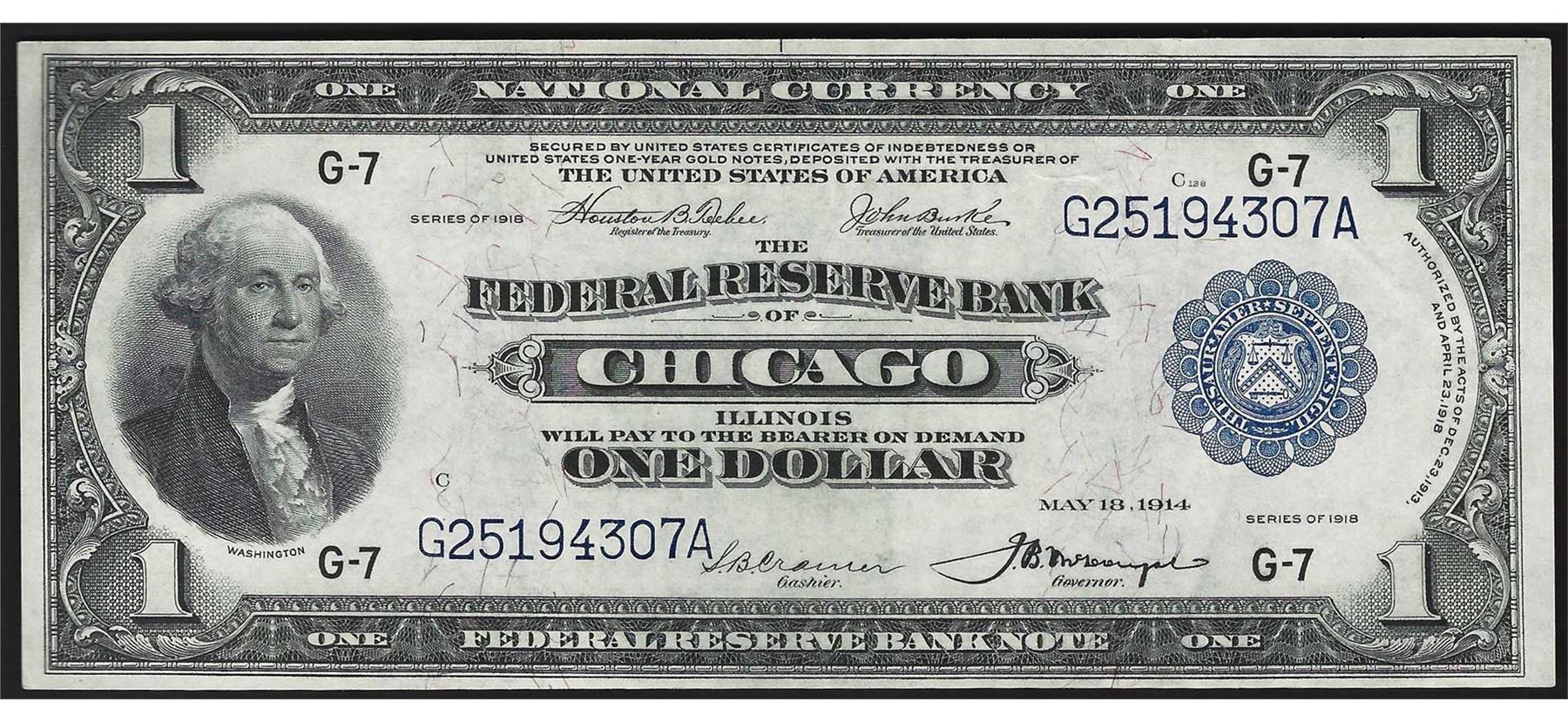 One 1918 $1 Federal Reserve Bank Note Chicago.