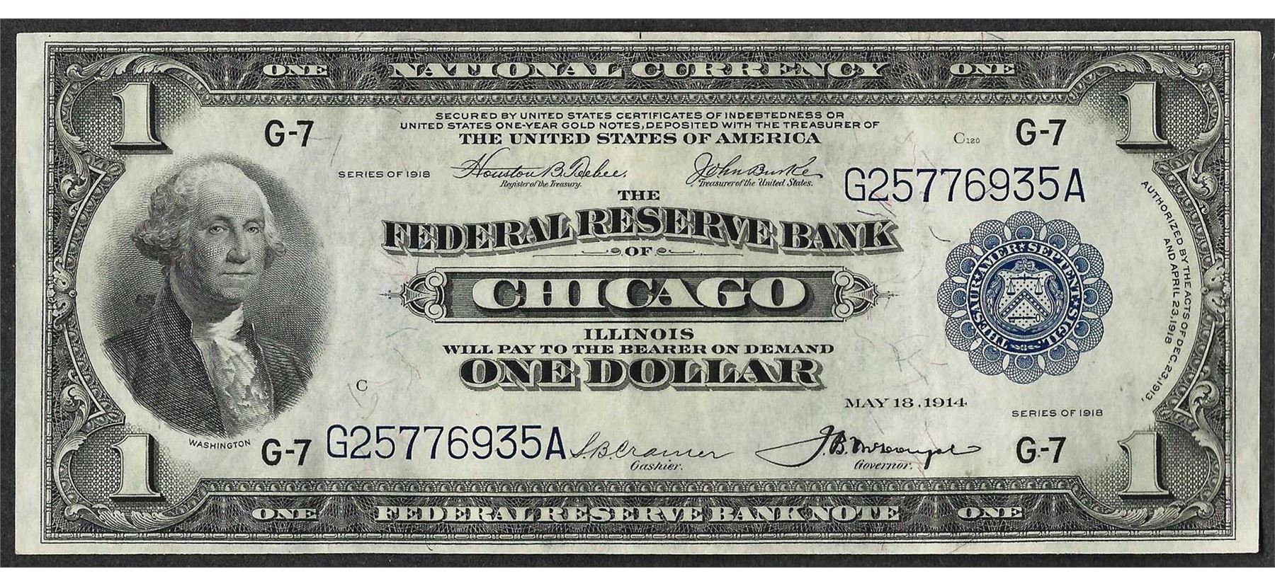 One 1918 $1 Federal Reserve Bank Note Chicago.