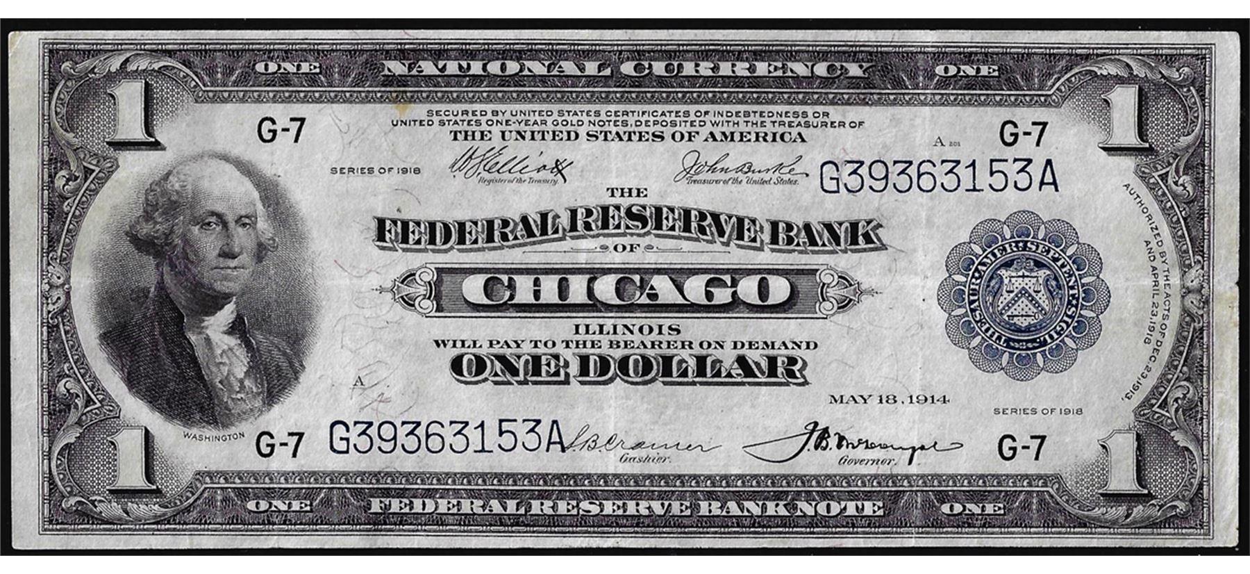 One 1918 $1 Federal Reserve Bank Note Chicago.
