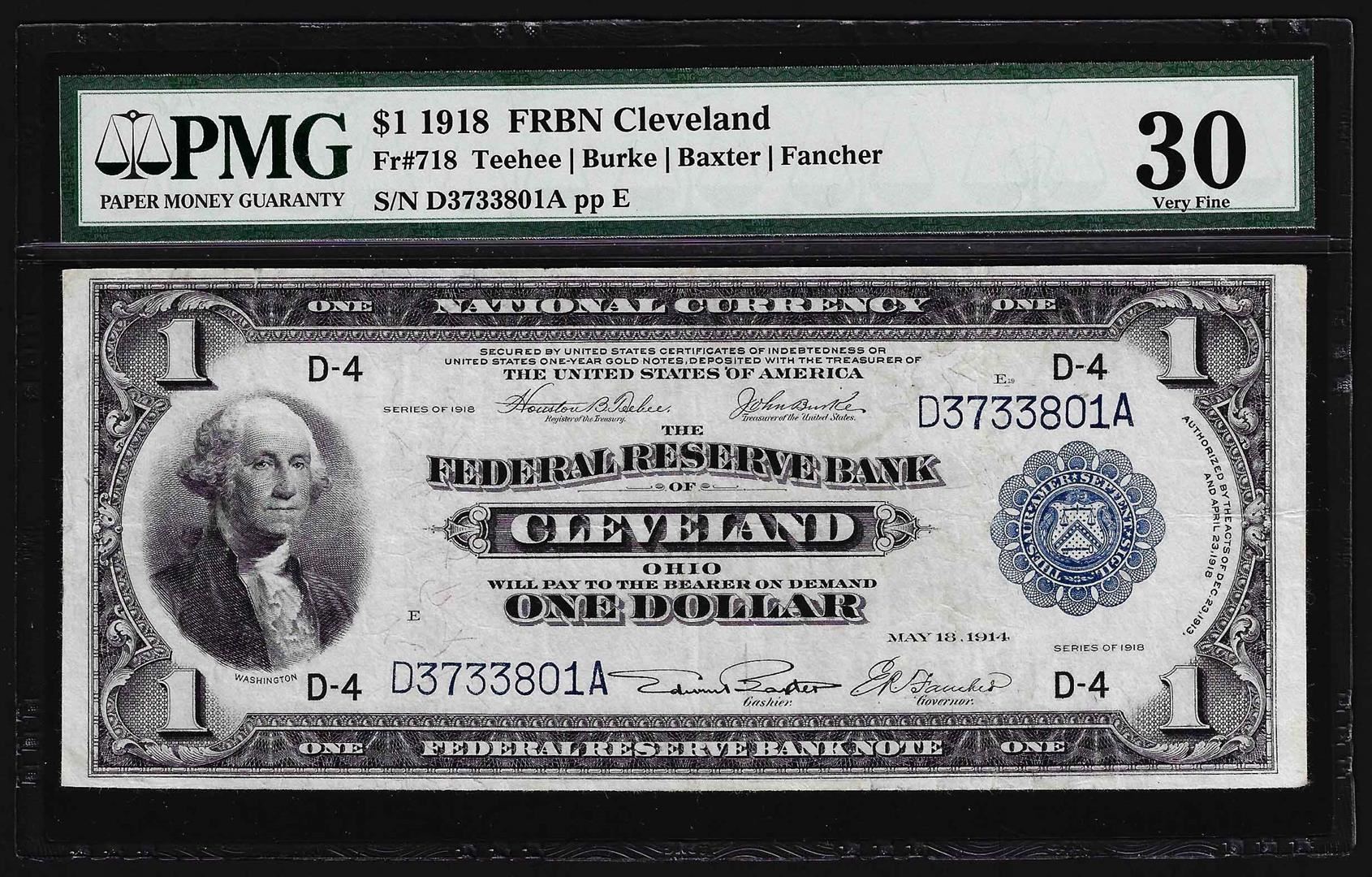 One 1918 $1 Federal Reserve Bank Note Cleveland Fr. 718 PMG Very Fine 30. PMG Certified.