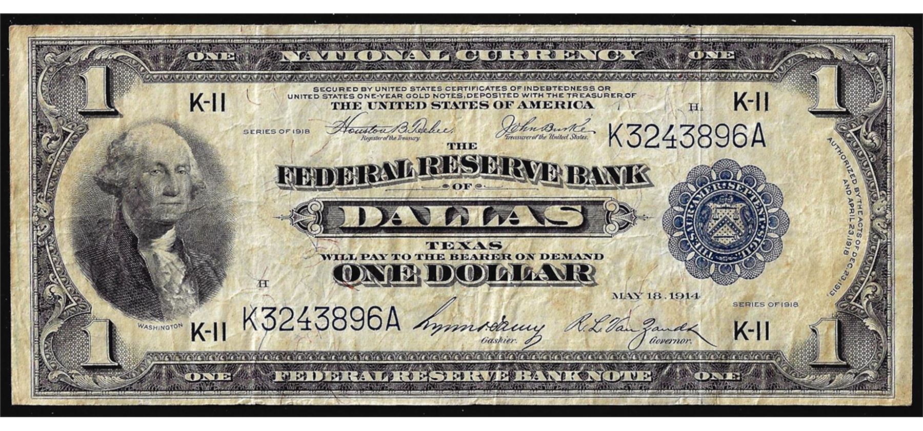 One 1918 $1 Federal Reserve Bank Note Dallas.
