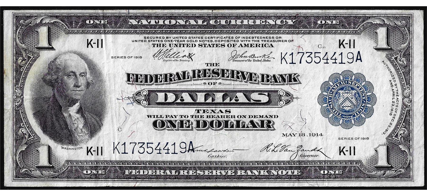 One 1918 $1 Federal Reserve Bank Note Dallas.