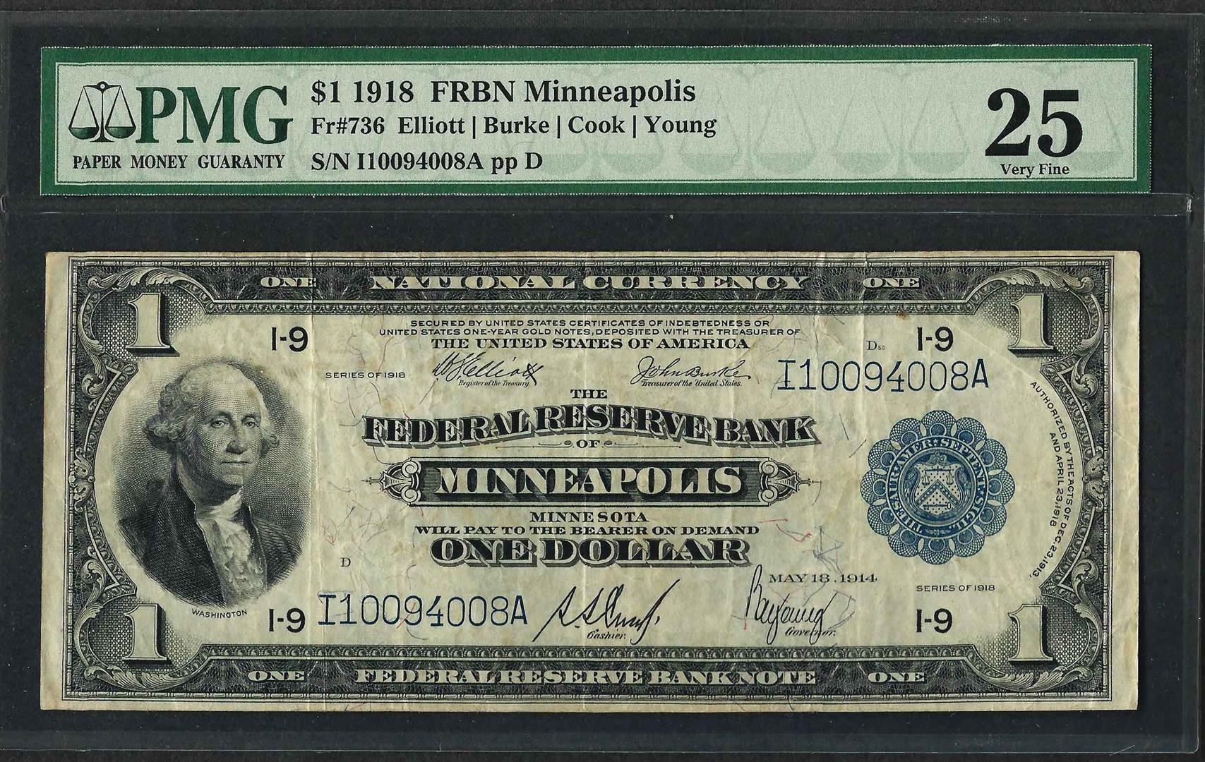 One 1918 $1 Federal Reserve Bank Note Minneapolis Fr.736 PMG Very Fine 25. PMG Certified.