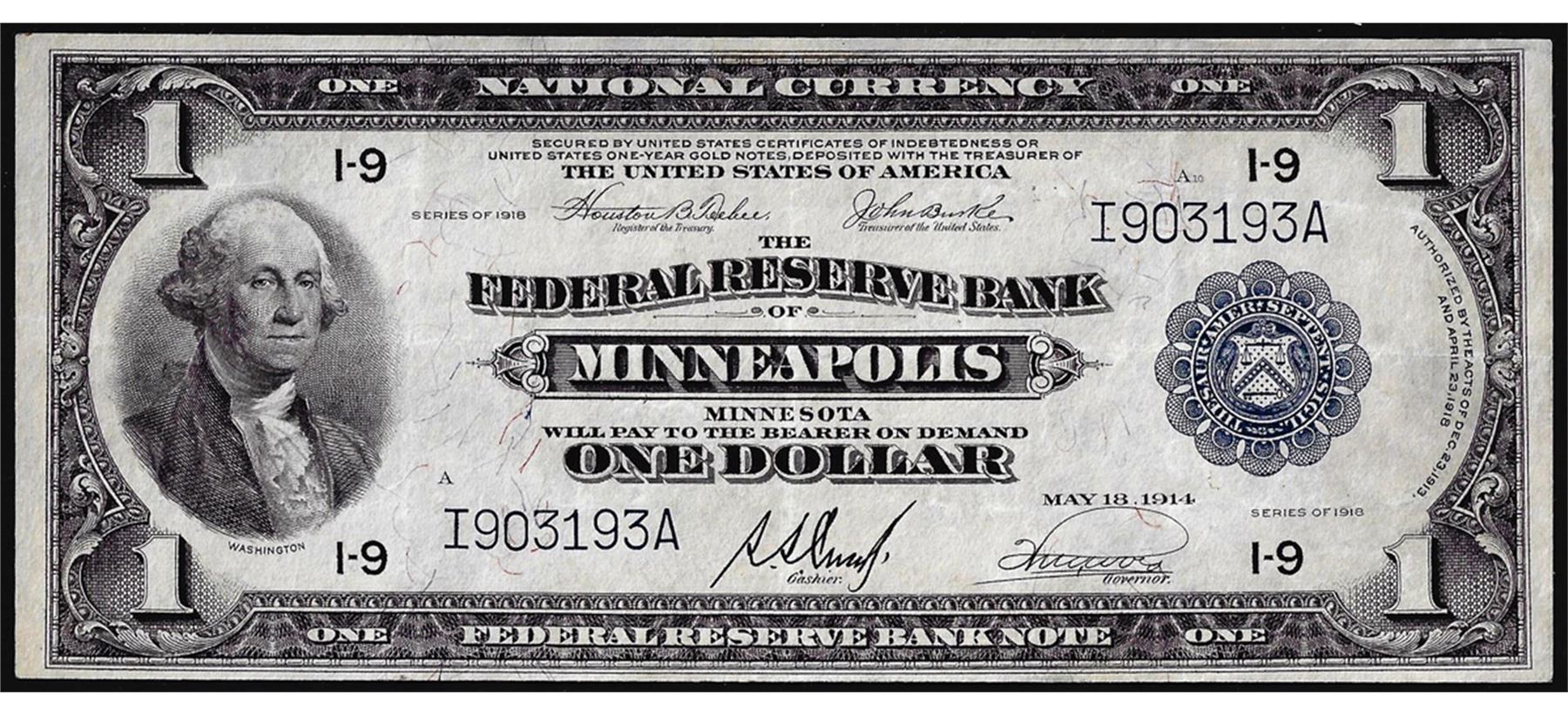 One 1918 $1 Federal Reserve Bank Note Minneapolis.