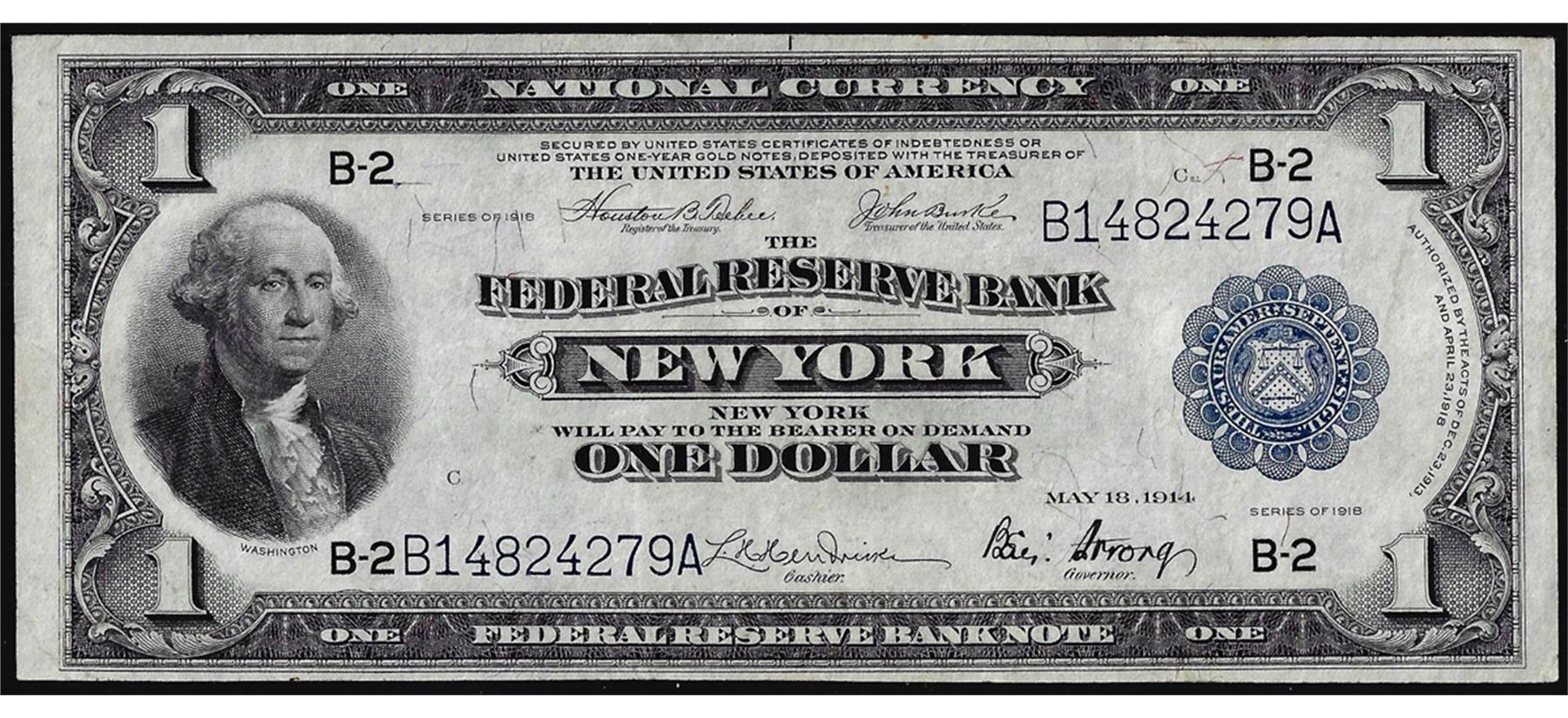 One 1918 $1 Federal Reserve Bank Note New York.