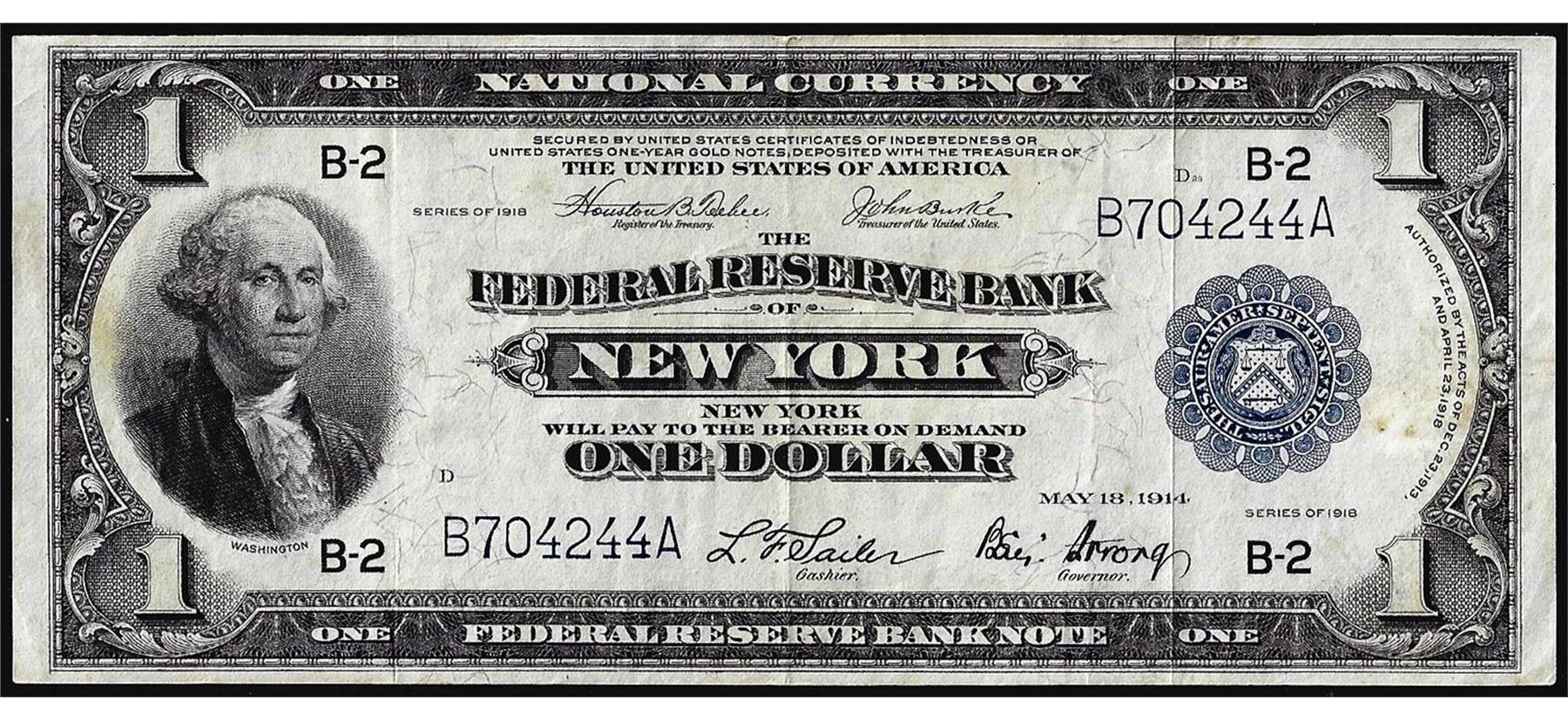 One 1918 $1 Federal Reserve Bank Note New York.
