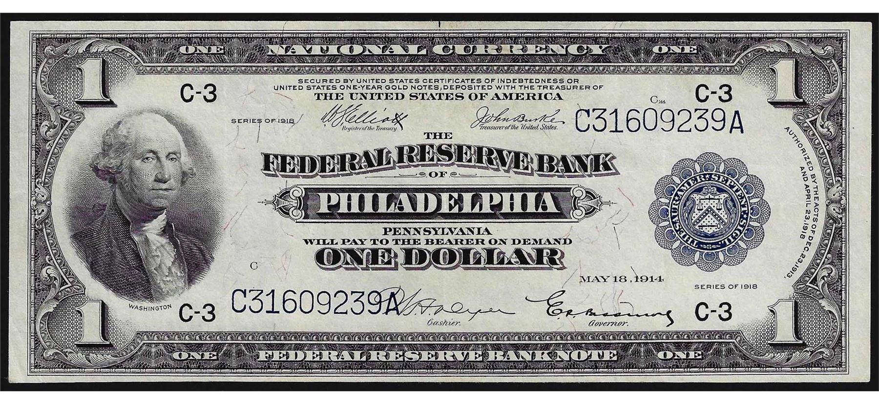 One 1918 $1 Federal Reserve Bank Note Philadelphia.