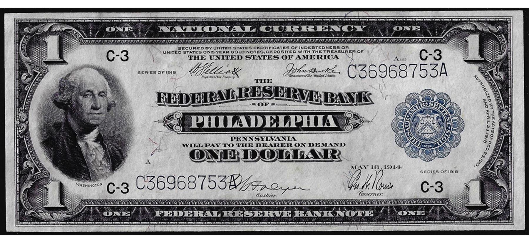 One 1918 $1 Federal Reserve Bank Note Philadelphia.