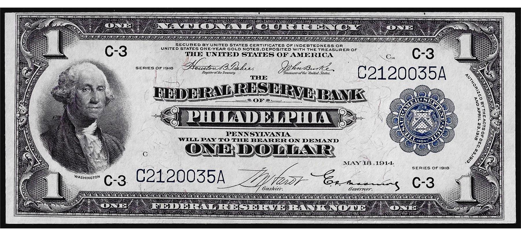 One 1918 $1 Federal Reserve Bank Note Philadelphia.