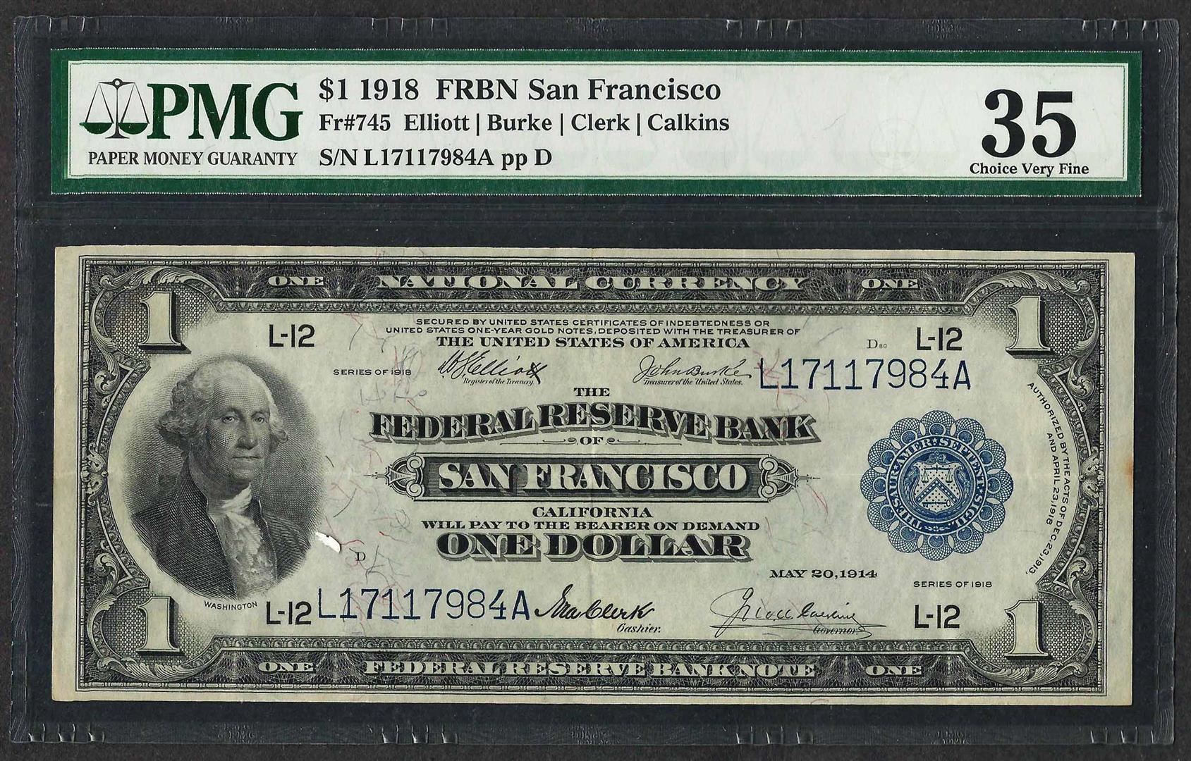 1918 $1 Federal Reserve Bank Note San Francisco Fr.745 PMG Choice Very Fine 35