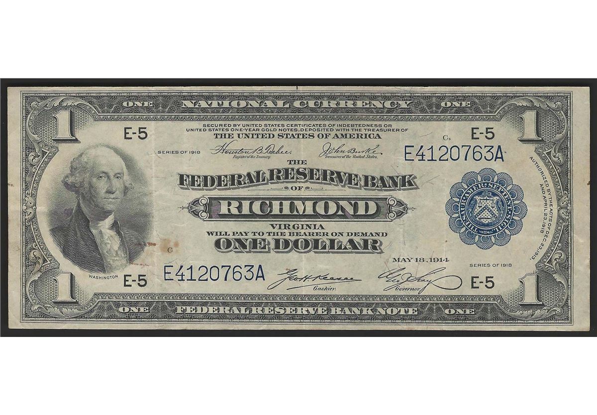 One 1918 $1 Federal Reserve Bank of Richmond, Virginia National Currency Note.