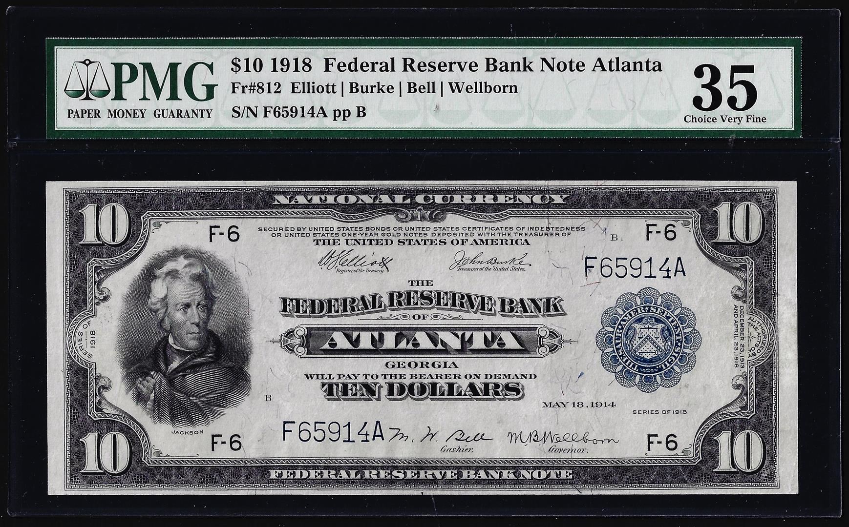One 1918 $10 Federal Reserve Note Atlanta Fr.812 PMG Choice Very Fine 35. PMG Certified.