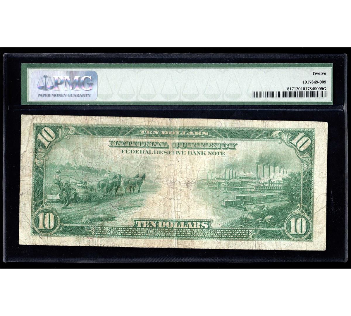 One 1918 $10 Large Size National Currency Note Kansas City Missouri PMG F12. PMG Certified.