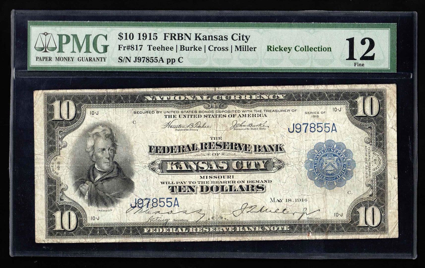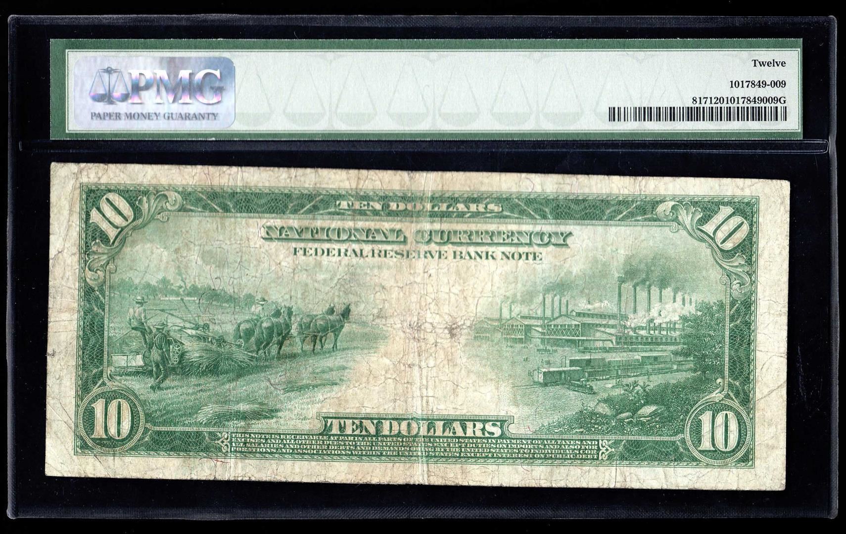 One 1918 $10 Large Size National Currency Note Kansas City Missouri PMG F12. PMG Certified.