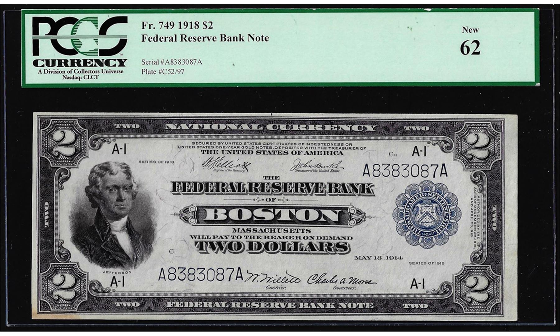 One 1918 $2 Battleship Federal Reserve Bank Note Boston Fr.749 PCGS New 62. PCGS Graded.
