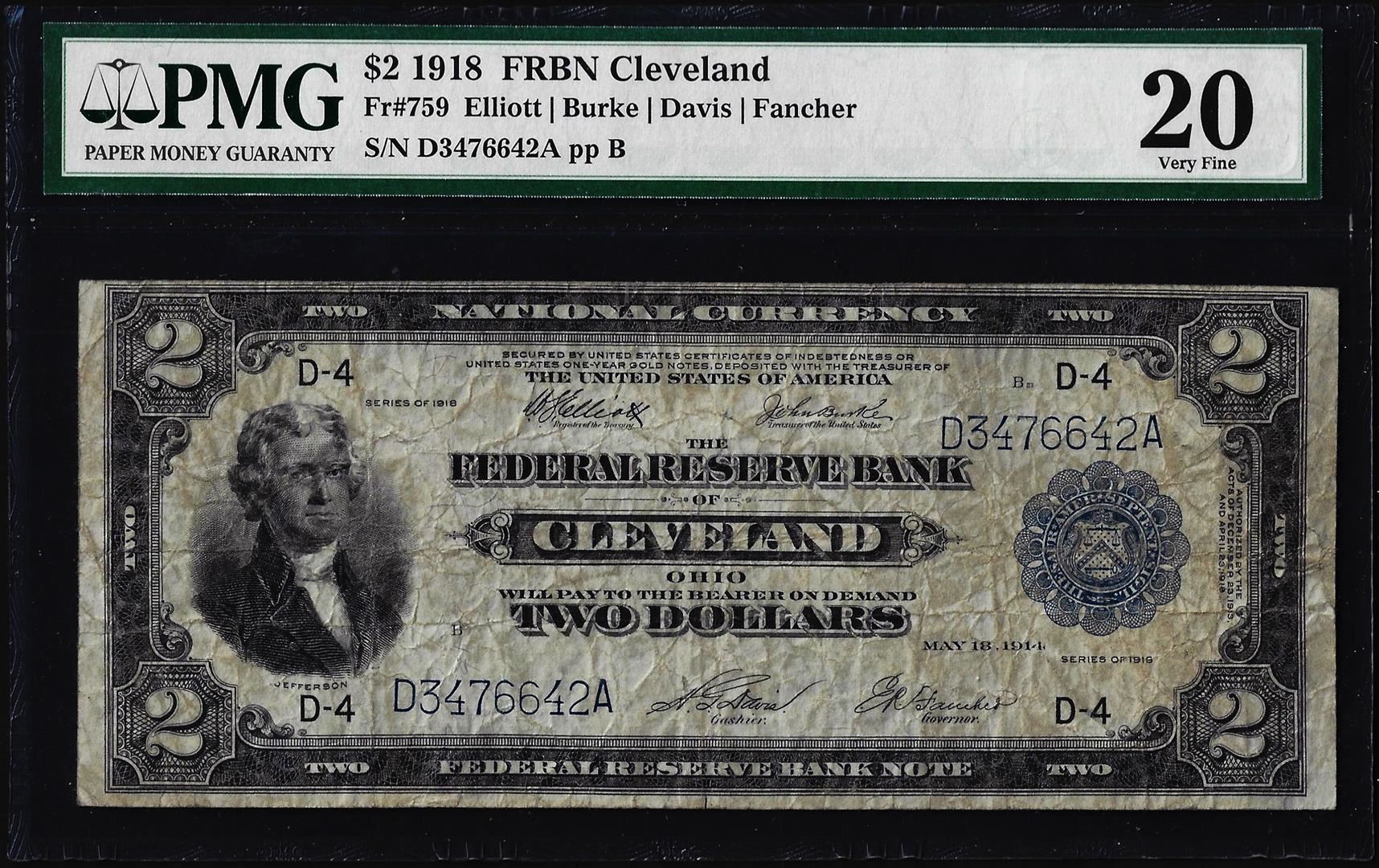 One 1918 $2 Battleship Federal Reserve Bank Note Cleveland Fr.759 PMG Very Fine 20. PMG Certified.