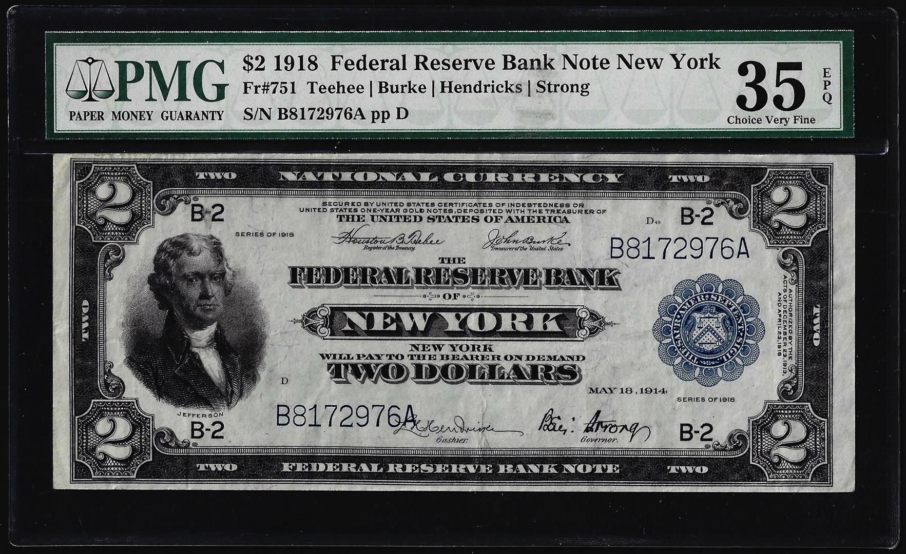 One 1918 $2 Battleship Federal Reserve Bank Note New York Fr.751 PMG Ch. Very Fine 35EPQ. PMG Certified.