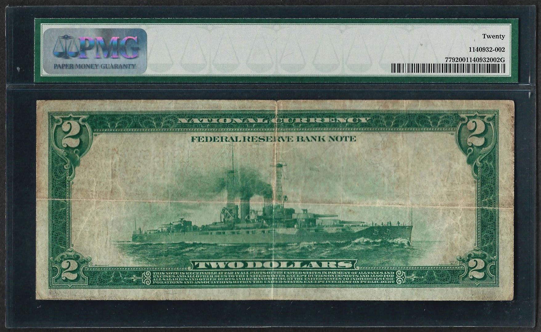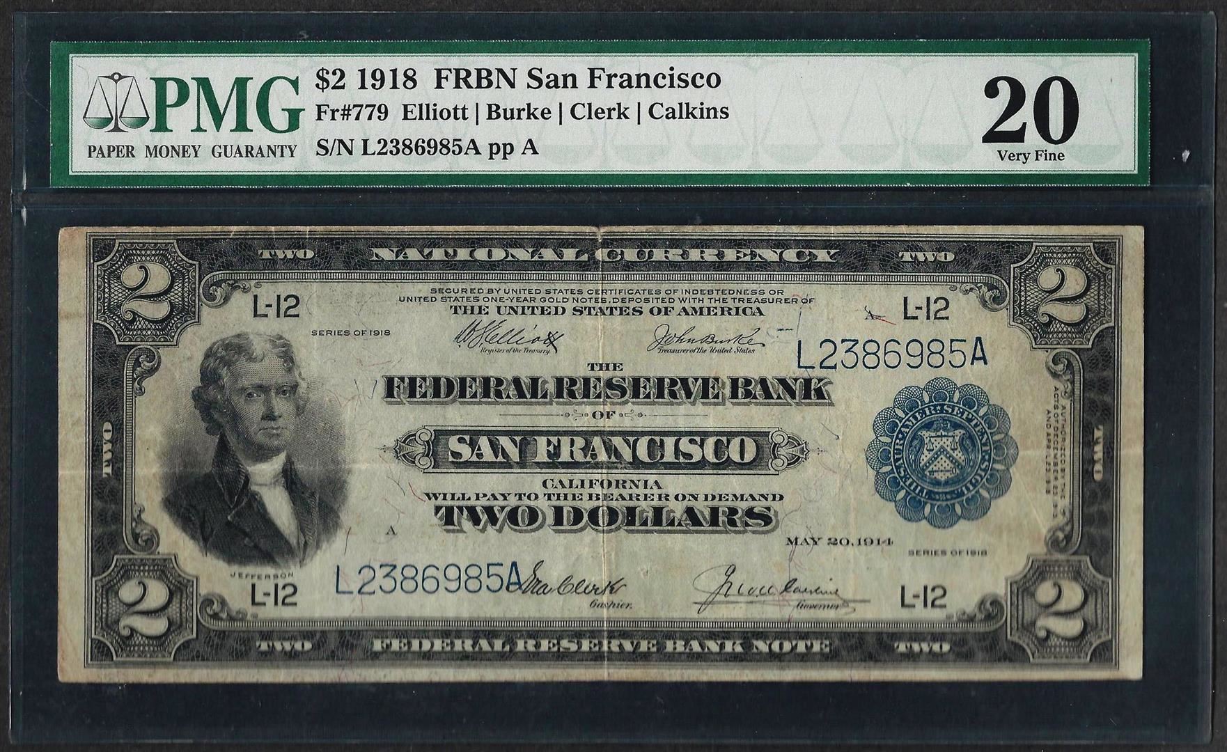 One 1918 $2 Battleship Federal Reserve Bank Note San Francisco Fr.779 PMG Very Fine 20. PMG Certified.