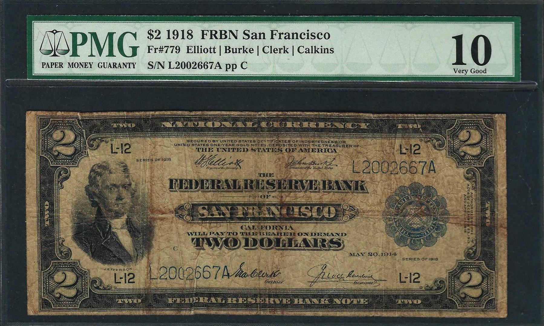One 1918 $2 Battleship Federal Reserve Bank Note San Francisco Fr.779 PMG Very Good 10. PMG Certified.
