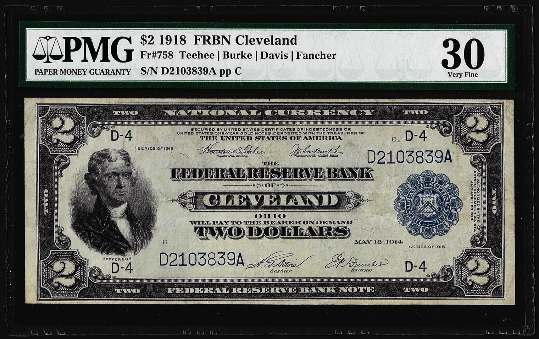 One 1918 $2 Battleship Federal Reserve Note Cleveland Fr.758 PMG Very Fine 30. PMG Certified.