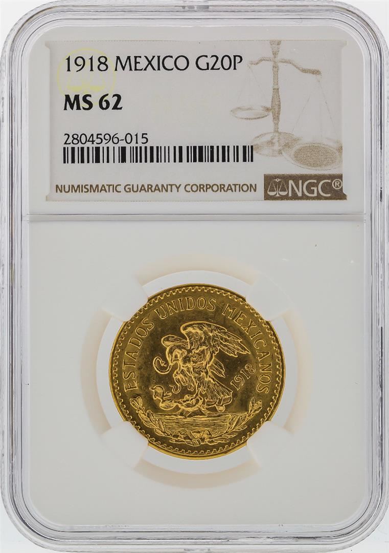 One 1918 20 Pesos Mexico Gold Coin NGC Graded MS62. NGC Certified.
