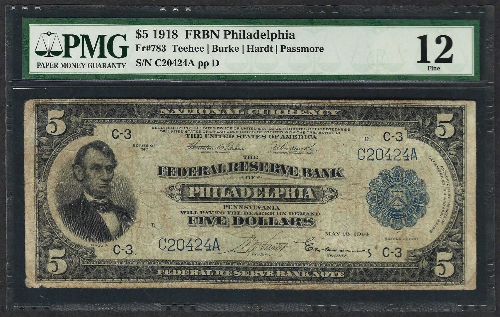 One 1918 $5 Federal Reserve Bank Note Philadelphia Fr.783 PMG Fine 12. PMG Certified.