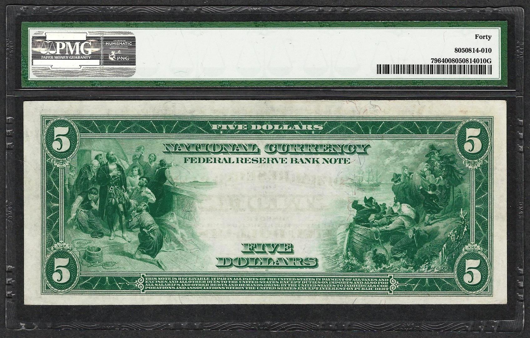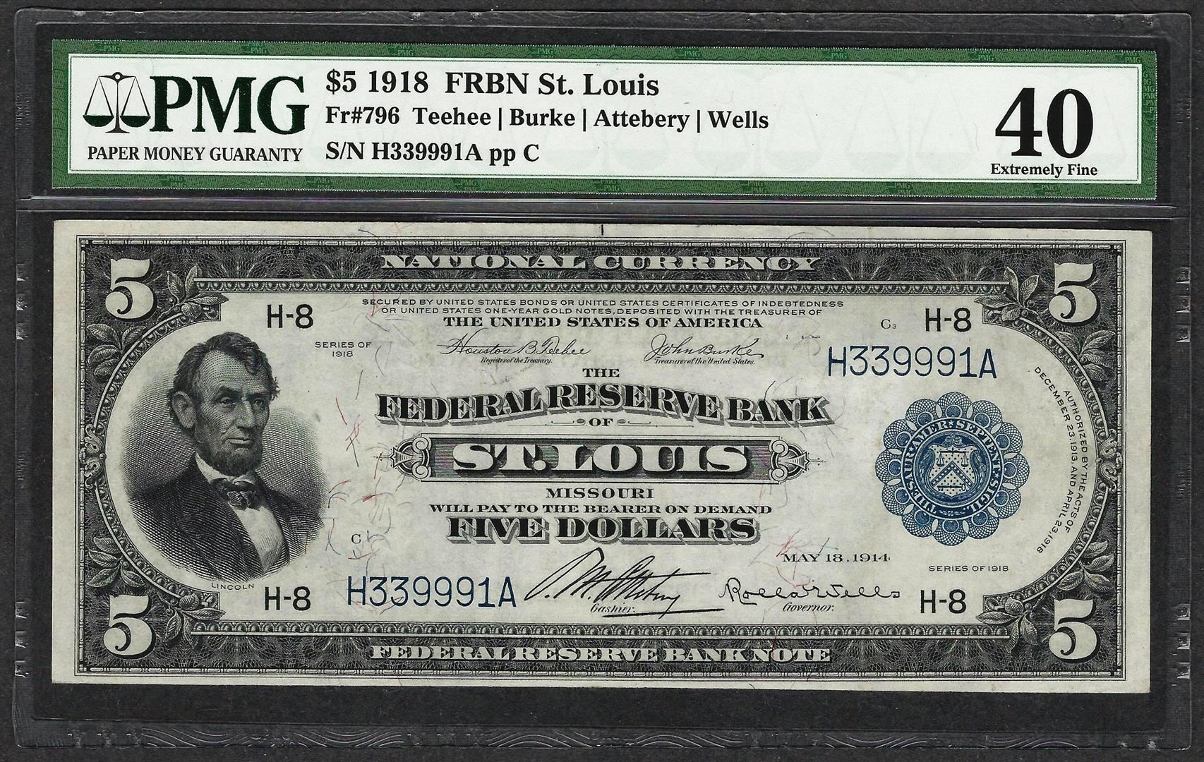 One 1918 $5 Federal Reserve Bank Note St. Louis Fr.796 PMG Extremely Fine 40. PMG Certified.