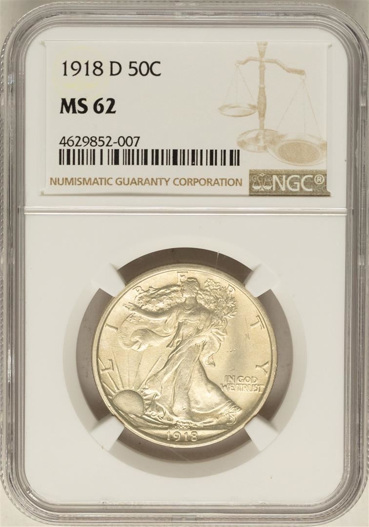 One 1918-D Walking Liberty Half Dollar Coin NGC MS62. NGC Certified.