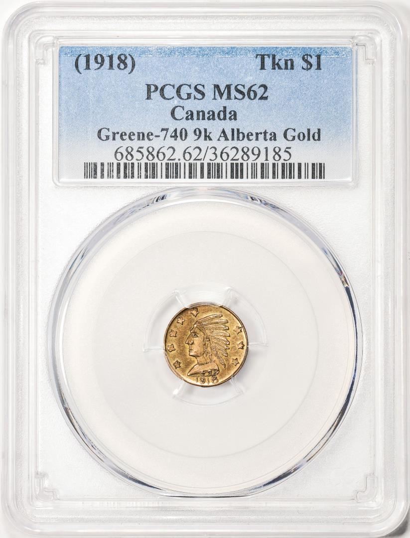 One 1918 Greene-740 9K $1 Alberta Gold Token PCGS MS62. PCGS Graded.