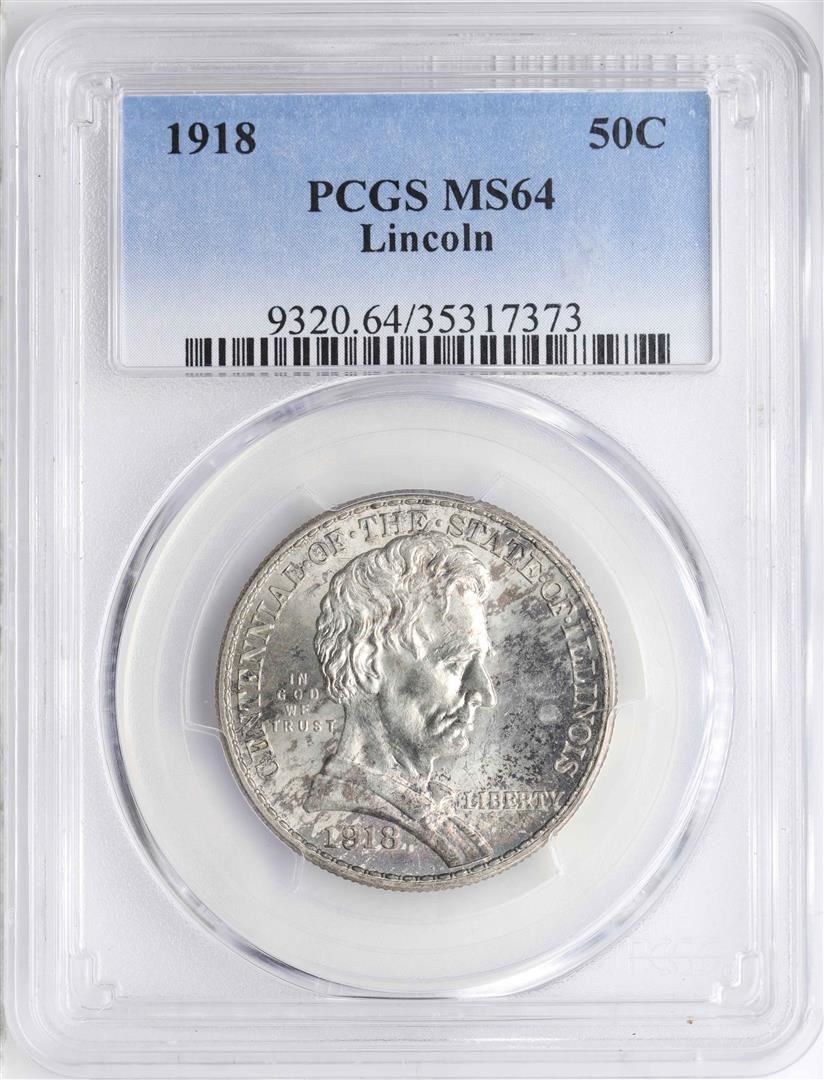 One 1918 Lincoln Illinois Centennial Commemorative Half Dollar Coin PCGS MS64. PCGS Graded.