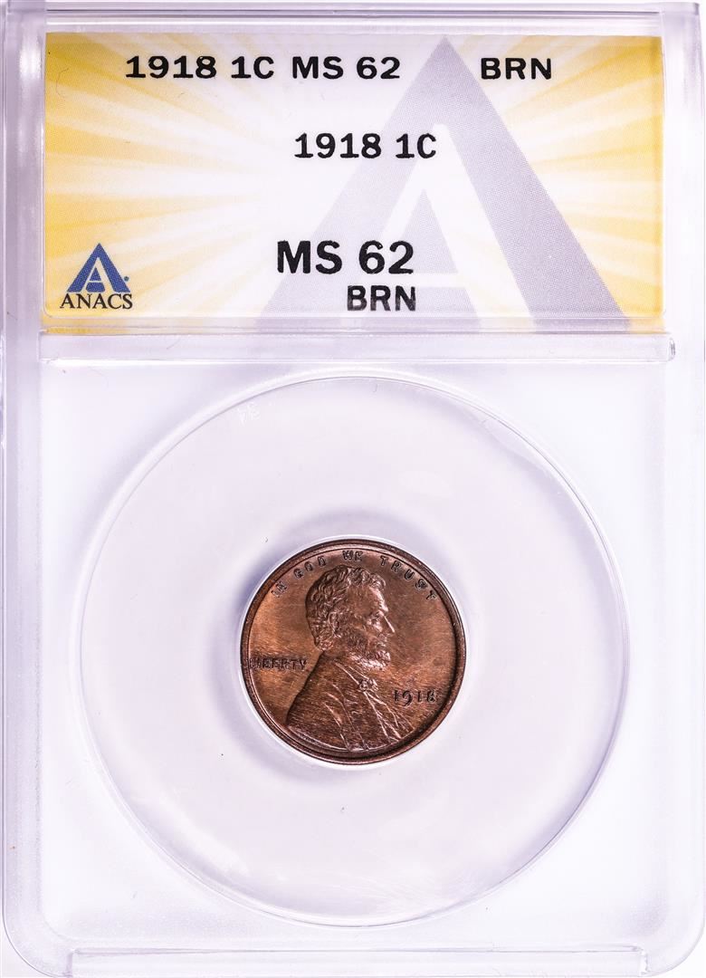 One 1918 Lincoln Wheat Cent Coin ANACS MS62 BRN. ANACS Certified.